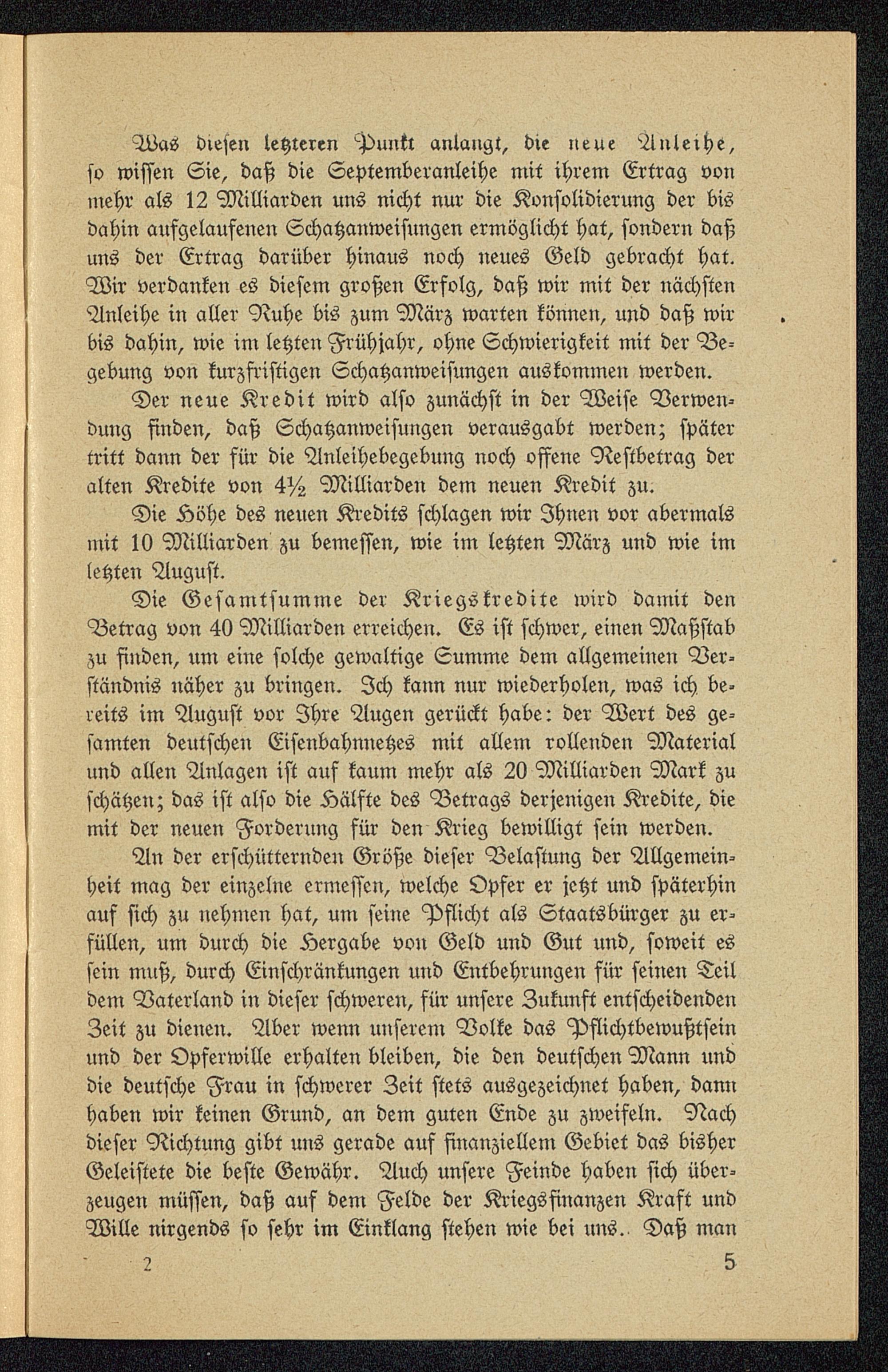 Die Gesamtsumme der Kriegskredite wird damit denBetrag von 40 Milliarden erreichen. Es ist schwer, einen Maßstabzu finden, um eine solche gewaltige Summe dem allgemeinen Ver-ständnis näher zu bringen. Ich kann nur wiederholen, was ich be-reits im August vor Ihre Augen gerückt habe: der Wert des ge-samten deutschen Eisenbahnnetzes mit allem rollenden Materialund allen Anlagen ist auf kaum mehr als 20 Milliarden Mark zuschätzen; das ist also die Äälfte des Betrags derjenigen Kredite, diemit der neuen Forderung für den Krieg bewilligt sein werden.