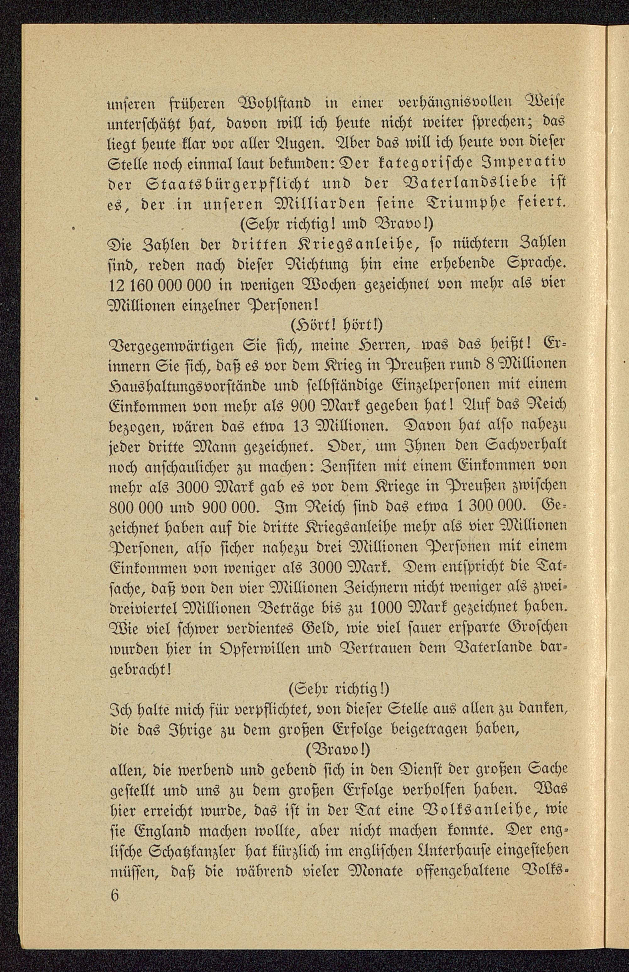 (Sehr richtig I und Bravo!)Die Zahlen der dritten Kriegsanleihe, so nüchtern Zahlensind, reden nach dieser Richtung hin eine erhebende Sprache.12 160 000 000 in wenigen Wochen gezeichnet von mehr als vierMillionen einzelner Personen!