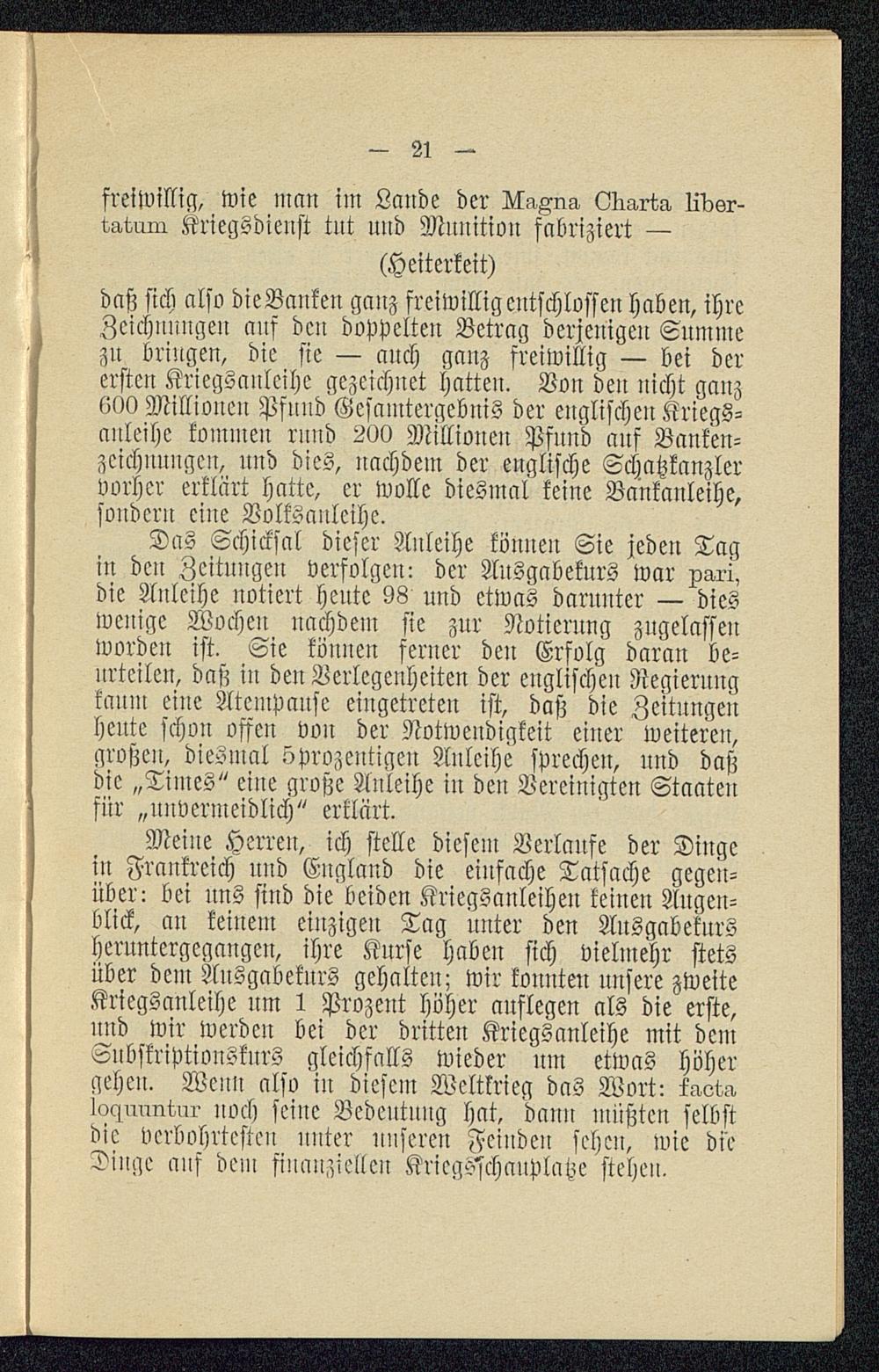 Meine Herren, ich stelle diesem Verlaufe der Diugcin Frankreich und Euglaud die einfache Tatsache gegen-über: bei uns sind die beiden Kriegsanleihen keinen Augen-blick, an keinem einzigen Tag unter den Ansgabekursheruntergegangen, ihre Kurse haben sich vielmehr stetsüber dem Ausgabekurs gehalten; wir konnten unsere zweiteKriegsanleihe um 1 Prozent höher auflegen als die erste,und wir werden bei der dritten Kriegsanleihe mit demSnbskriptionsknrs gleichfalls wieder um etwas höhergehen. Weuu also iu diesem Weltkrieg das Wort: kaot^lo^nnnwi- noch seine Bedeutung hat, dann müßten selbstdie verbohrtesten nnter unserm Feinden sehen, wie dieDinge ans dem finanziellen Kriegcichanplahe stehen.