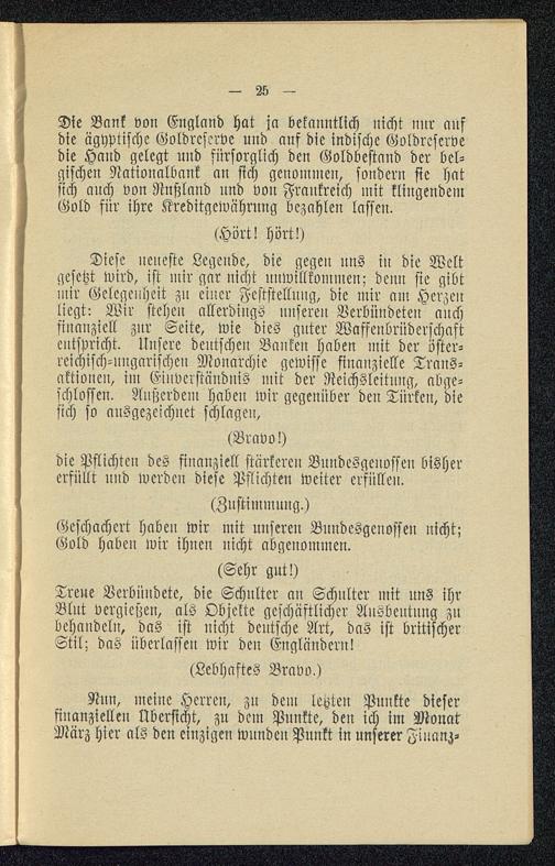 Diese neueste Legende, die gegen nns in die Weltgesetzt wird, ist mir gar nicht unwillkommen; denn sie gibtmir Gelegenheit zu einer Feststellung, die mir am Herzenliegt: Wir stehen allerdings unseren Verbündeten anchfinanziell znr Seite, wie dies guter Waffenbrüderschaftentspricht. Unsere deutschen Banken haben mit der öster-reichisch-ungarischen Monarchie gewisse finanzielle Trans-aktionen, im Einverständnis mit der Ncichsleitung, abge-schlossen. Außerdem haben wir gegenüber deu Türken, diesich so ausgezeichnet schlagen,