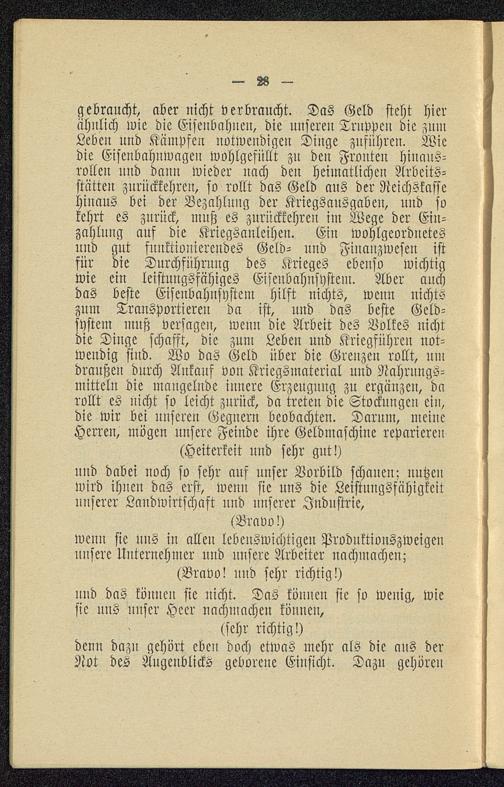 gebraucht, aber nicht verbraucht. Das Geld steht hierähnlich wie die Eisenbahnen, die unseren Trnppeu die zumLebeu und Kämpfen notwendige» Dinge zuführen. Wiedie Eisenbahnwagen wohlgefüllt zn den Fronten hinaus-rollen und dann wieder uach deu heimatlichen Arbeits-stätten zurückkehren, so rollt das Geld aus der Neichskassehinaus bei der Bezahlung der Kriegsausgaben, und sokehrt es zurück, muß es zurückkehren im Wege der Ein-zahlung auf die Kriegsauleihen. Ein wohlgeordnetesund gnt funktionierendes Geld- uud Finanzwesen istfür die Durchführung des Krieges ebenso wichtigwie ein leistungsfähiges Eiscnbahnsystem. Aber auchdas beste Eisenbahnsystem hilft nichts, wenn nichtezum Transportieren da ist, und das beste Geld-system muß versagen, wenn die Arbeit des Volkes nichtdie Dinge schafft, die zum Lebeu und Kriegführeu not-wendig sind. Wo das Geld über die Grenzen rollt, umdraußen durch Ankauf von Kriegsmaterial und Nahrungs-mitteln die mangelnde innere Erzeugung zu ergänzen, darollt es uicht so leicht zurück, da treten die Stockungen ein,die wir bei unserm Gegnern beobachten. Darum, meineHerren, mögen unsere Feinde ihre Geldmaschine reparieren(Heiterkeit und sehr gut!)