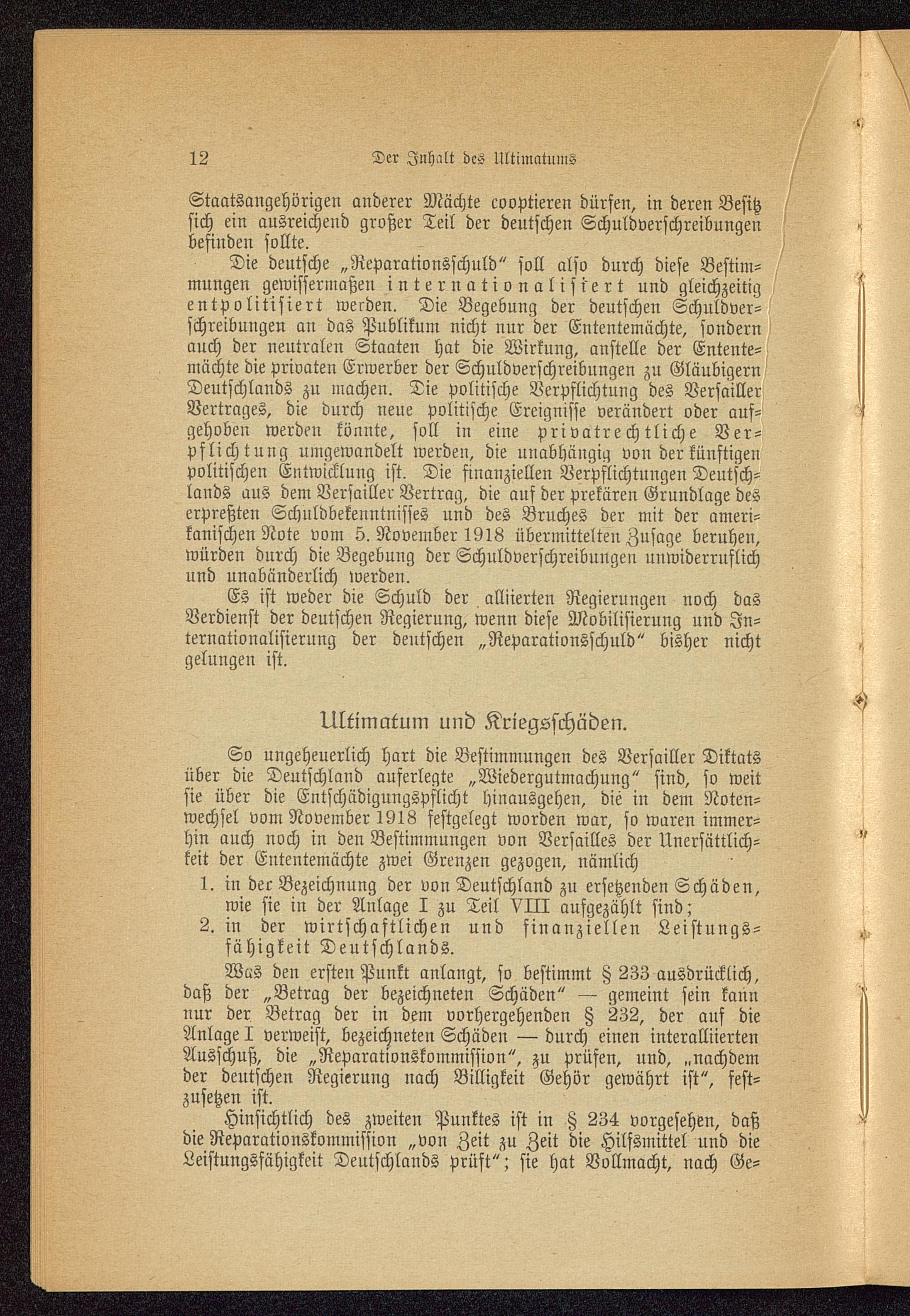 So ungeheuerlich hart die Bestimmungen des Versailler Diktatsüber die Deutschland auferlegte „Wiedergutmachung" sind, so weitsie über die Entschädigungspflicht hinausgehen, die in dem Noten-wechsel vom November 1918 festgelegt worden war, so waren immer-hin auch noch in den Bestimmungen von Versailles der Unersättlich-keit der Ententemächte zwei Grenzen gezogen, nämlich
