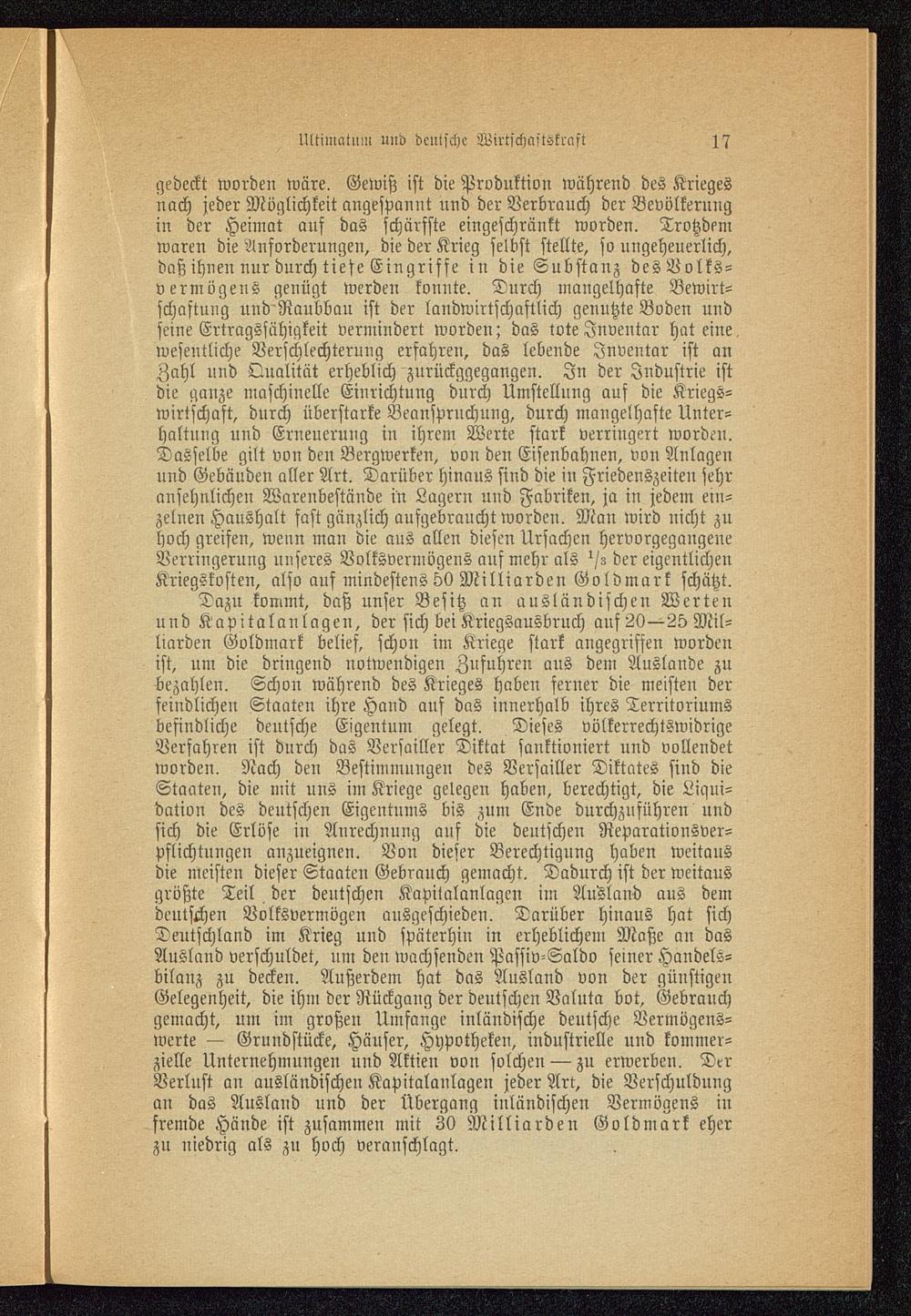 Dazu kommt, daß unser Besitz an ausländischen Wertenund Kapitalanlagen, der sich bei Kriegsausbruch auf 20—2b Mil-liarden Goldmark belief, schon im Kriege stark angegriffen wordenist, um die dringend notwendigen Zufuhren aus dem Auslande zubezahlen. Schon während des Krieges haben serner die meisten derfeindlichen Staaten ihre Hand auf das innerhalb ihres Territoriumsbefindliche deutsche Eigentum gelegt. Dieses völkerrechtswidrigeVerfahren ist durch das Versailler Diktat sanktioniert und vollendetworden. Nach den Bestimmungen des Versailler Diktates sind dieStaaten, die mit uns im Kriege gelegen haben, berechtigt, die Liqui-dation des deutschen Eigentums bis zum Ende durchzuführen undsich die Erlöse in Anrechnung auf die deutschen Reparationsver-pflichtungen anzueignen. Von dieser Berechtigung haben weitausdie meisten dieser Staaten Gebrauch gemacht. Dadurch ist der weitausgrößte Teil der deutschen Kapitalanlagen im Ausland aus demdeutschen Volksvermögen ausgeschieden. Darüber hinaus hat sichDeutschland im Krieg und späterhin in erheblichem Maße an dasAusland verschuldet, um den wachsenden Passiv-Saldo seiner Handels-bilanz zu decken. Außerdem hat das Ausland von der günstigenGelegenheit, die ihm der Rückgang der deutschen Valuta bot, Gebrauchgemacht, um im großen Umfange inländische deutsche Vermögens-werte — Grundstücke, Häuser, Hypotheken, industrielle uud kommer-zielle Unternehmungen und Aktien von solchen — zu erwerben. DerVerlust an ausländischen Kapitalanlagen jeder Art, die Verschuldungan das Ausland und der Übergang inländischen Vermögens infremde Hände ist zusammen mit 30 Milliarden Gold mark eherzu niedrig als zu hoch veranschlagt.