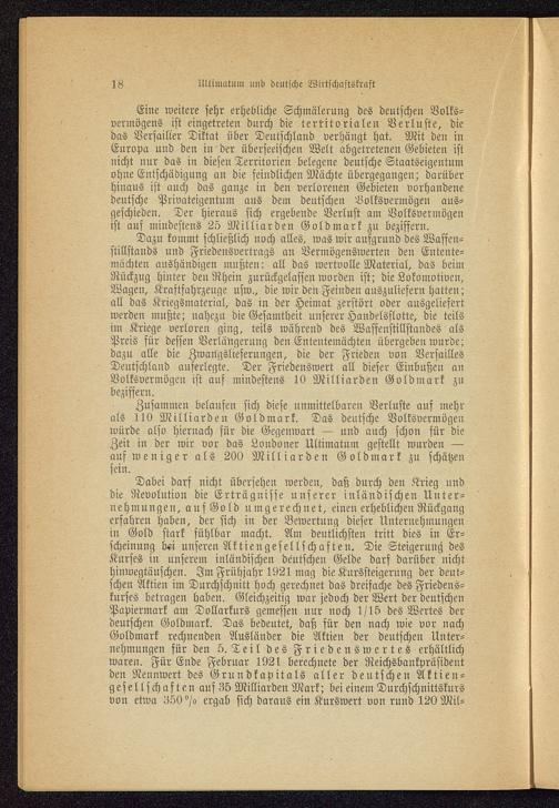 Zusammen belaufen sich diese unmittelbaren Verluste auf mehrals 110 Milliarden Goldmark. Das deutsche Volksvermögeuwürde also hiernach für die Gegenwart — und auch schon sür dieZeit in der wir vor das Londoner Ultimatum gestellt wurden —auf weniger als 200 Milliarden Goldmark zu schätzensein.