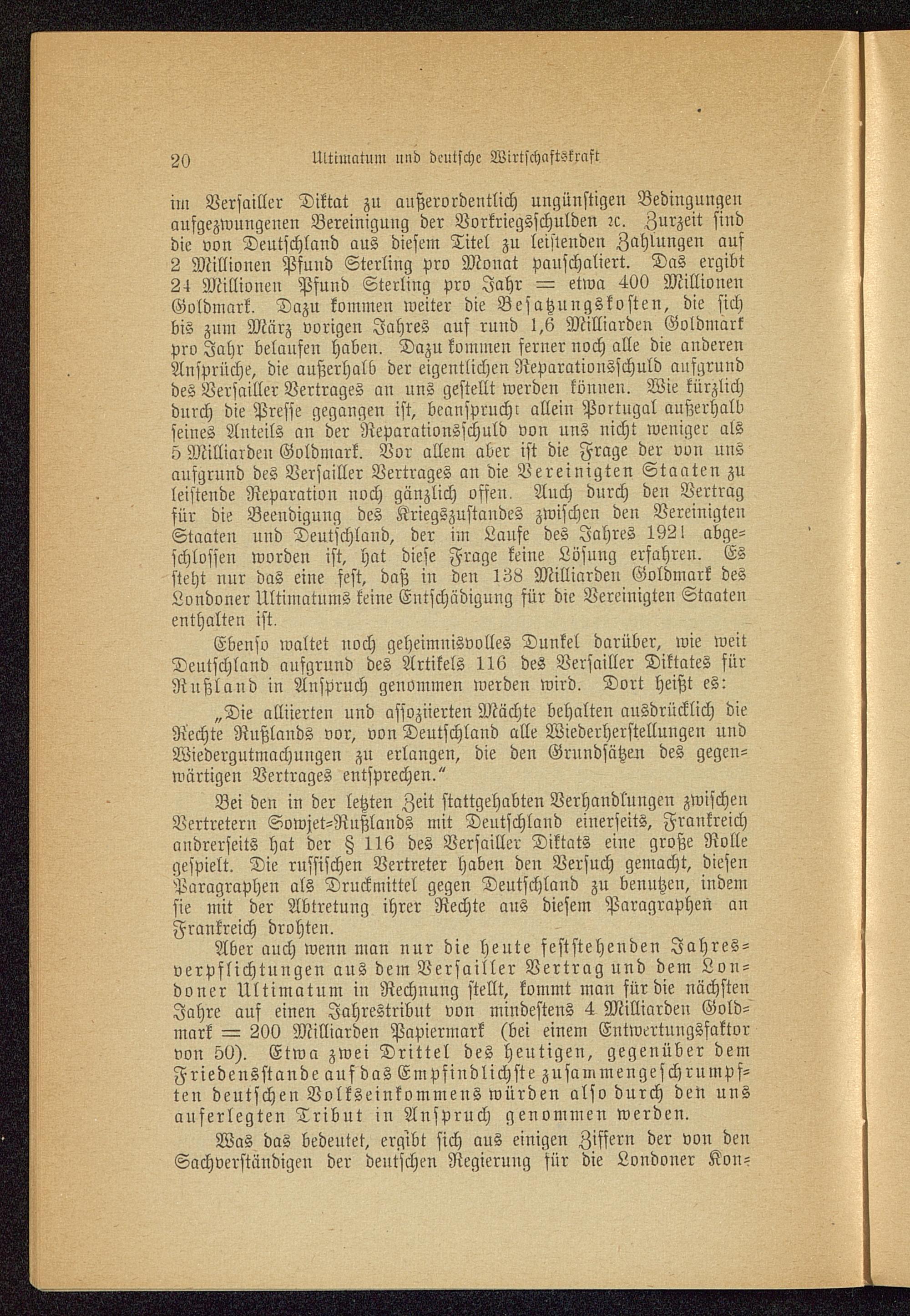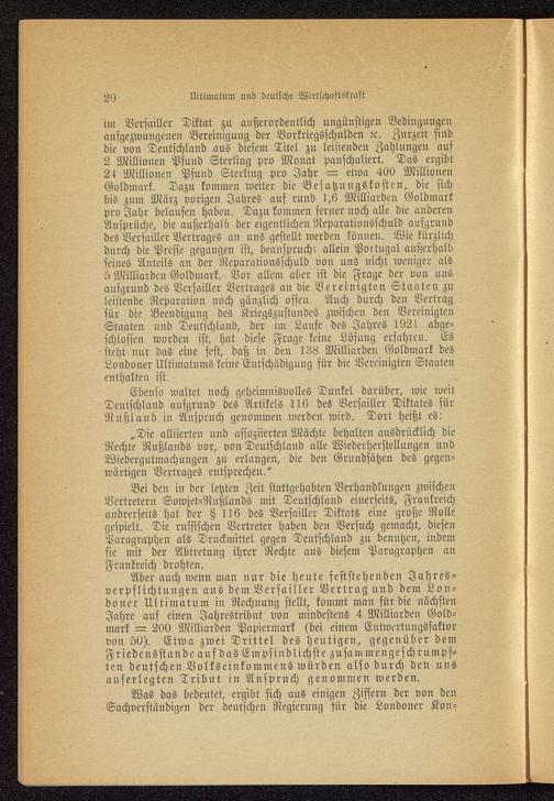 Ebenso waltet noch geheimnisvolles Dunkel darüber, wie weitDeutschland aufgrund des Artikels 116 des Versailler Diktates fürRußland in Anspruch genommen werden wird. Dort heißt es: