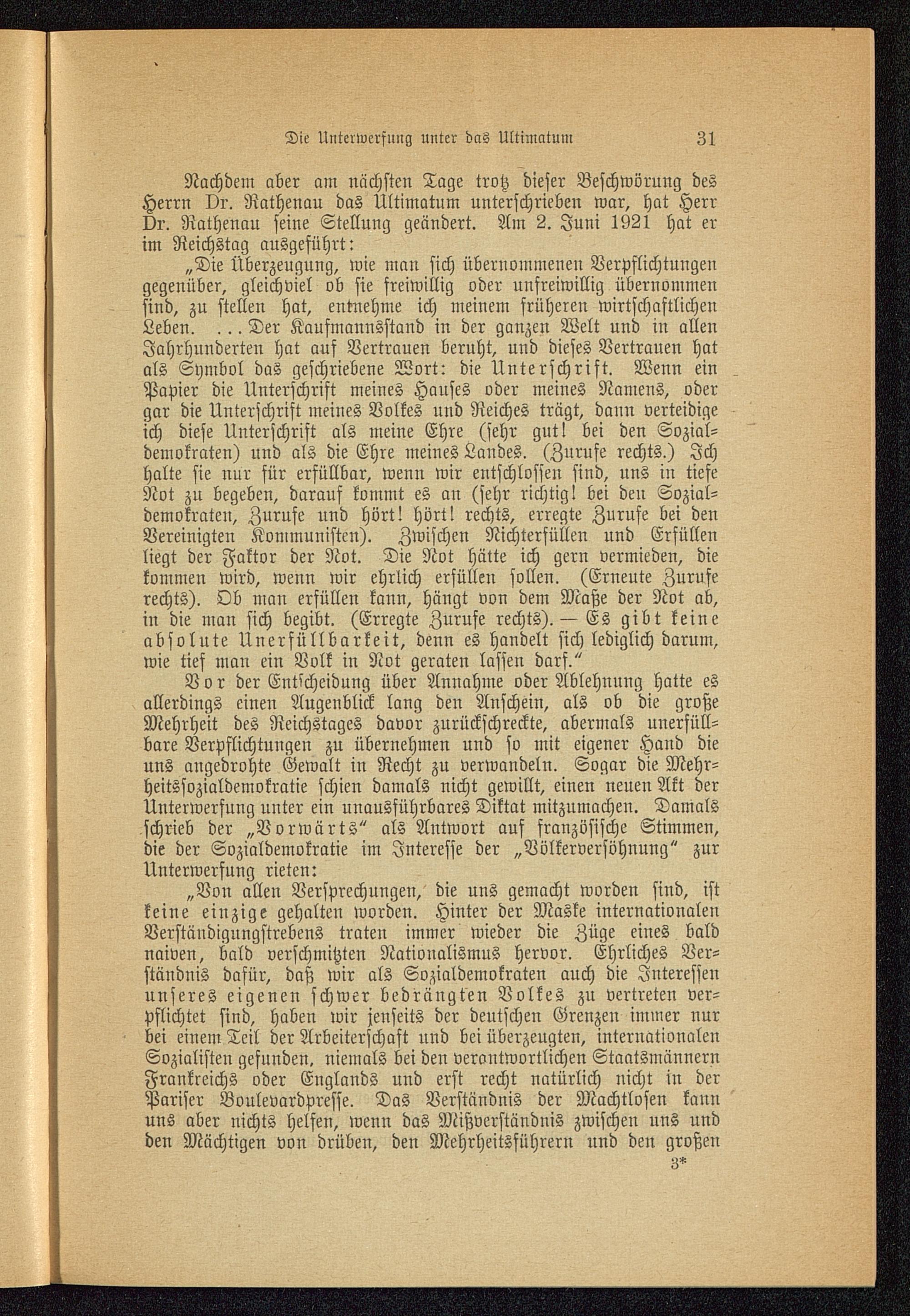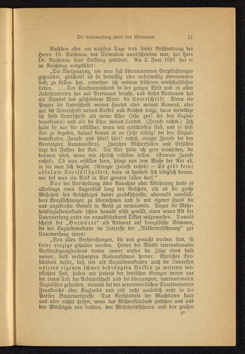„Die Überzeugung, wie man sich übernommenen Verpflichtungengegenüber, gleichviel ob sie freiwillig oder unfreiwillig übernommensind, zu stellen hat, entnehme ich meinem früheren wirtschaftlichenLeben. ... Der Kaufmannsstand in der ganzen Welt und in allenJahrhunderten hat auf Vertrauen beruht, und dieses Vertrauen hatals Symbol das geschriebene Wort: die Unterschrift. Wenn einPapier die Unterschrift meines Hauses oder meines Namens, odergar die Unterschrift meines Volkes und Reiches trägt, daun verteidigeich diese Unterschrift als meine Ehre (sehr gutl bei den Sozial-demokraten) und als die Ehre meines Landes. (Zurufe rechts.) Ichhalte sie nur für erfüllbar, wenn wir entschlossen sind, uns in tiefeNot zu begeben, darauf kommt es an (sehr richtig! bei den Sozial-demokraten, Zurufe und hört! hört! rechts, erregte Zurufe bei denVereinigten Kommunisten). Zwischen Nichtersüllen und Erfüllenliegt der Faktor der Not. Die Not hätte ich gern vermieden, diekommen wird, wenn wir ehrlich erfüllen sollen. (Erneute Zuruferechts). Ob man erfüllen kann, hängt von dem Maße der Not ab,in die man sich begibt. (Erregte Zurufe rechts). — Es gibt keineabsolute Unerfüllbarkeit, denn es handelt sich lediglich darum,wie tief man ein Volk in Not geraten lassen darf."