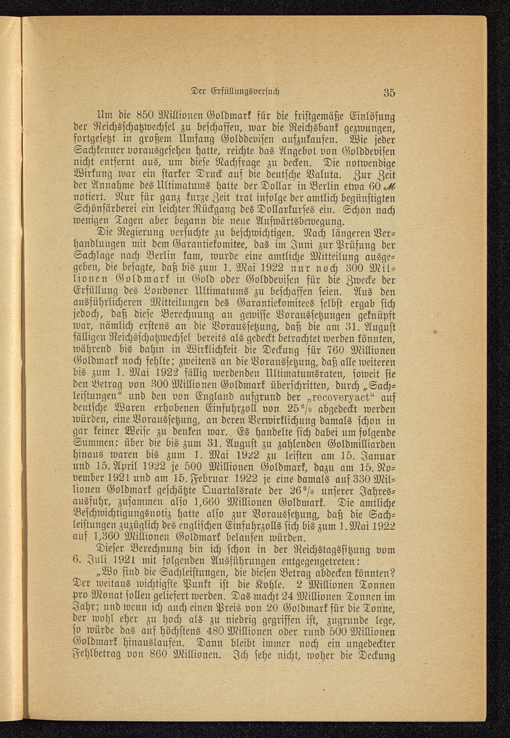 „Wo sind die Sachleistungen, die diesen Betrag abdecken könnten?Der weitaus wichtigste Punkt ist die Kohle. 2 Millionen Tonnenpro Monat sollen geliefert werden. Das macht 24 Millionen Tonnen imJahr; uud wenn ich auch einen Preis von 20 Goldmark für die Tonne,der wohl eher zu hoch als zu niedrig gegriffen ist, zugrunde lege,so würde das auf höchstens 480 Millionen oder rund 500 MillionenGoldmark hinauslaufen. Dann bleibt immer noch ein ungedeckterFehlbetrag von 860 Millionen. Ich sehe nicht, woher die Deckung