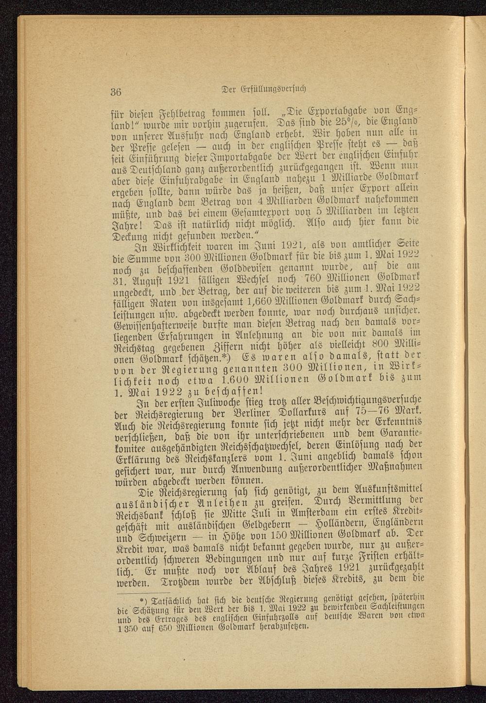 In Wirklichkeit waren im Juni 1921, als von amtlicher Seiledie Summe von 300 Millionen Goldmark für die bis zum 1. Mai 1922noch zu beschaffenden Golddevisen genannt wurde, aus die am31. August 1921 fälligen Wechsel noch 760 Millionen Goldmarkungedeckt, und der Betrag, der auf die weiteren bis zum I.Mai 1922fälligen Raten von insgesamt 1,660 Millionen Goldmark dnrch Sach-leistungen usw. abgedeckt werden konnte, war noch durchaus unsicher.Gewissenhafterweise durfte man diesen Betrag nach den damals vor-liegenden Erfahrungen in Anlehnung an die von nur damals imReichstag gegebenen Ziffern nicht höher als vielleicht MO Milli-onen Goldmark schätzen.*) Es waren also damals, statt dervon der Regierung genannten 300 Millionen, in Wirk-lichkeit noch etwa 1.600 Millionen Goldmark bis zum1. Mai 1922 zu beschaffen!