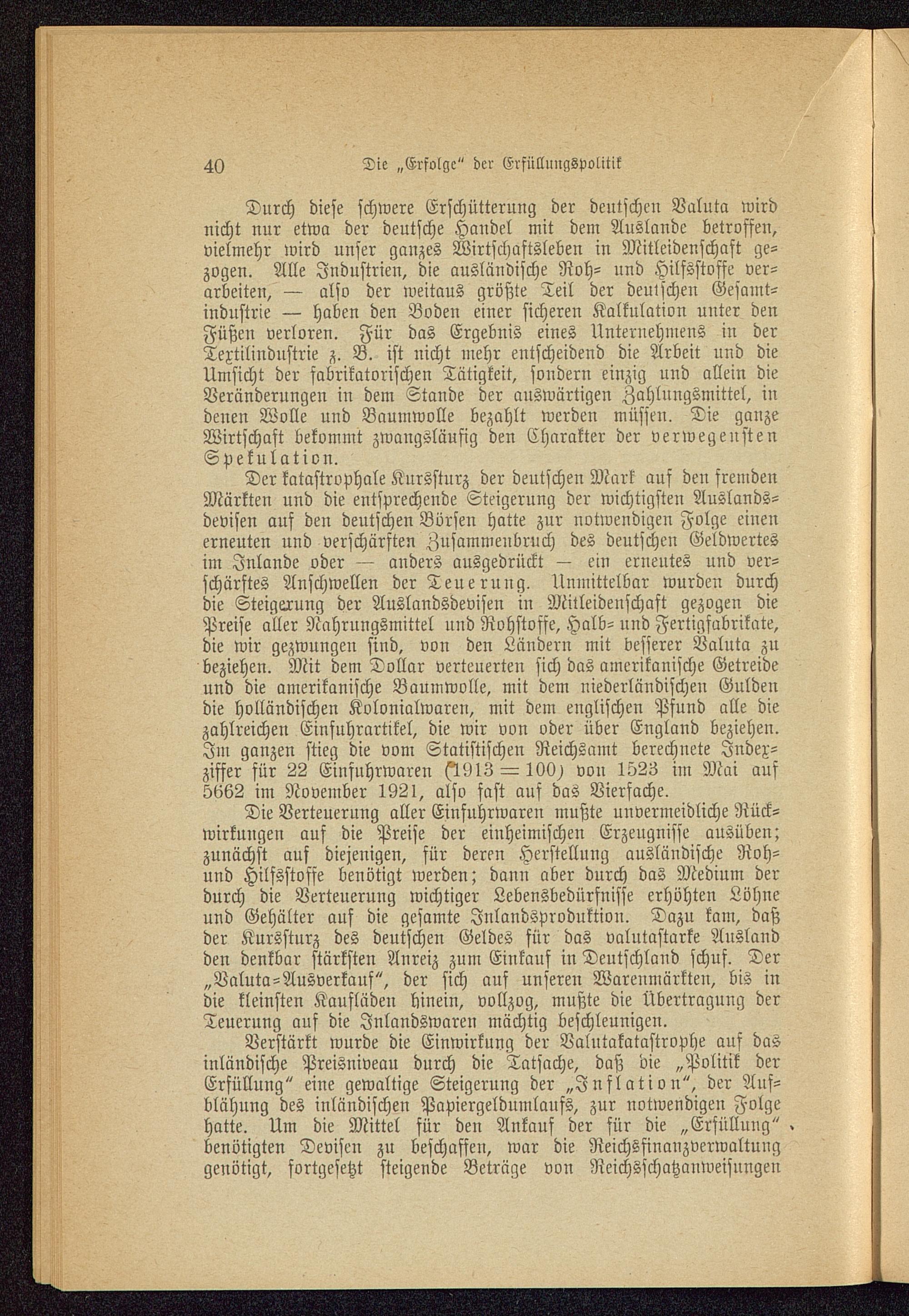 Verstärkt wurde die Einwirkung der Valutakatastrophe auf dasinländische Preisniveau durch die Tatsache, daß die „Politik derErfüllung" eine gewaltige Steigerung der „Inflation", der Auf-blähung des inländischen Papiergeldumlaufs, zur notwendigen Folgehatte. Um die Mittel für den Ankauf der für die „Erfüllung" .benötigten Devisen zu beschaffen, war die Reichsfinanzverwaltunggenötigt, fortgesetzt steigende Beträge von Reichsschatzanweisungen