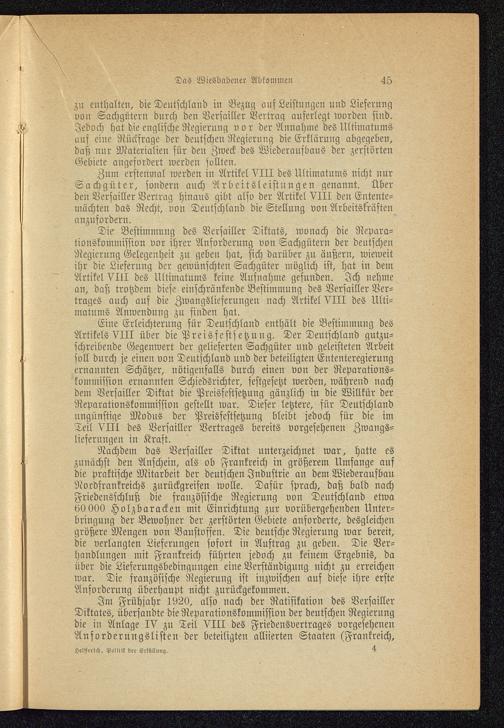 zu enthalten, die Deutschland in Bezug auf Leistungen und Lieferungvon Sachgütern durch den Versailler Vertrag auferlegt worden sind.Jedoch hat die englische Regierung vor der Annahme des Ultimatumsauf eine Rückfrage der deutschen Regierung die Erklärung abgegeben,daß nur Materialien für den Zweck des Wiederaufbaus der zerstörtenGebiete augefordert werden sollten.
