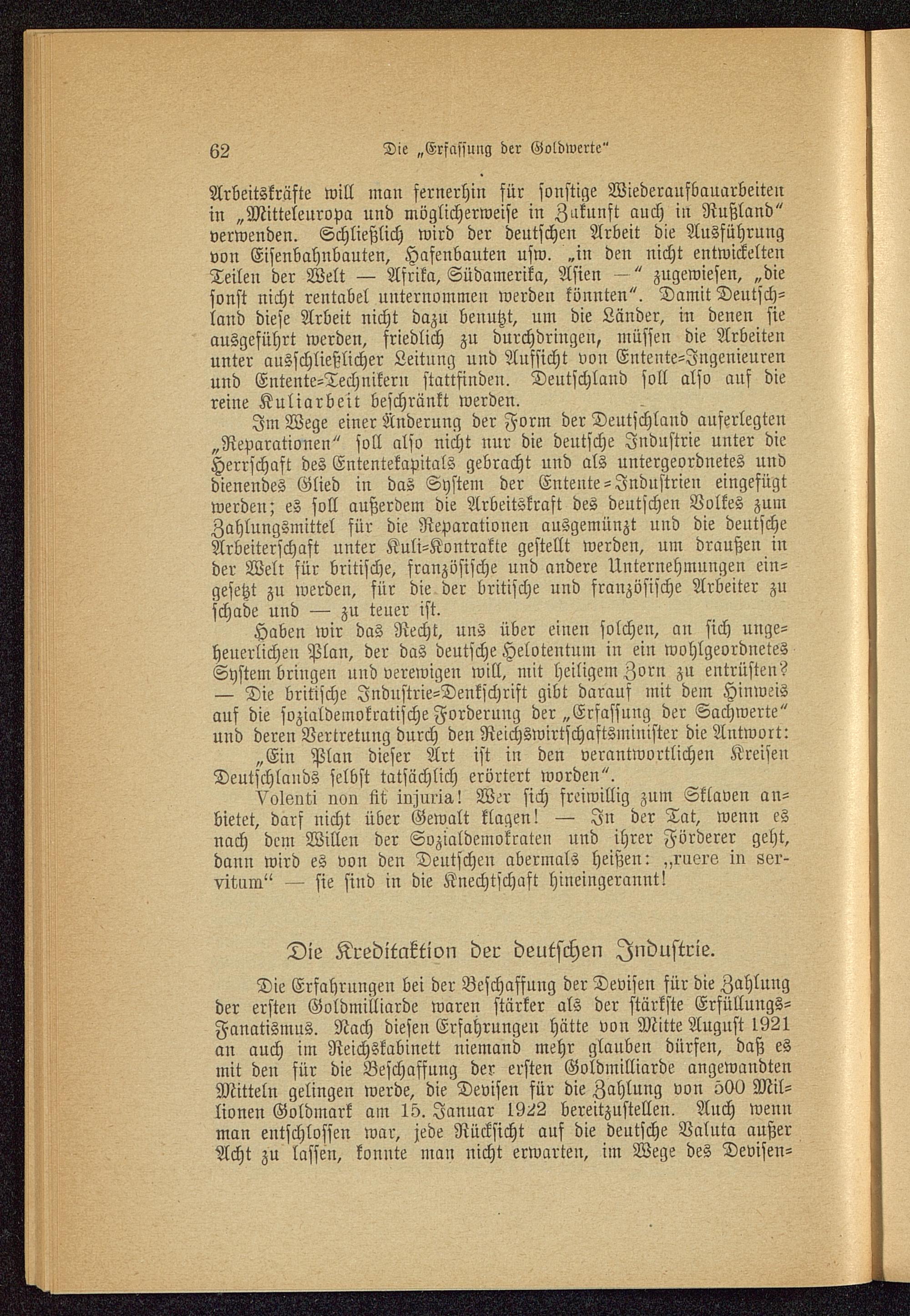 Die Erfahrungen bei der Beschaffung der Devisen für die Zahlungder ersten Goldmilliarde waren stärker als der stärkste Erfüllungs-Fanatismus. Nach diesen Erfahrungen hätte von Mitte August l921an auch im Reichskabinett niemand mehr glauben dürfen, daß esmit den für die Beschaffung der ersten Goldmilliarde angewandtenMitteln gelingen werde, die Devisen für die Zahlung von dOl) Mil-lionen Goldmark am 15. Januar l9^2 bereitzustellen. Anch wennman entschlossen war, jede Rücksicht auf die deutsche Valuta außerAcht zu lassen, konnte man nicht erwarten, im Wege des Devisen-