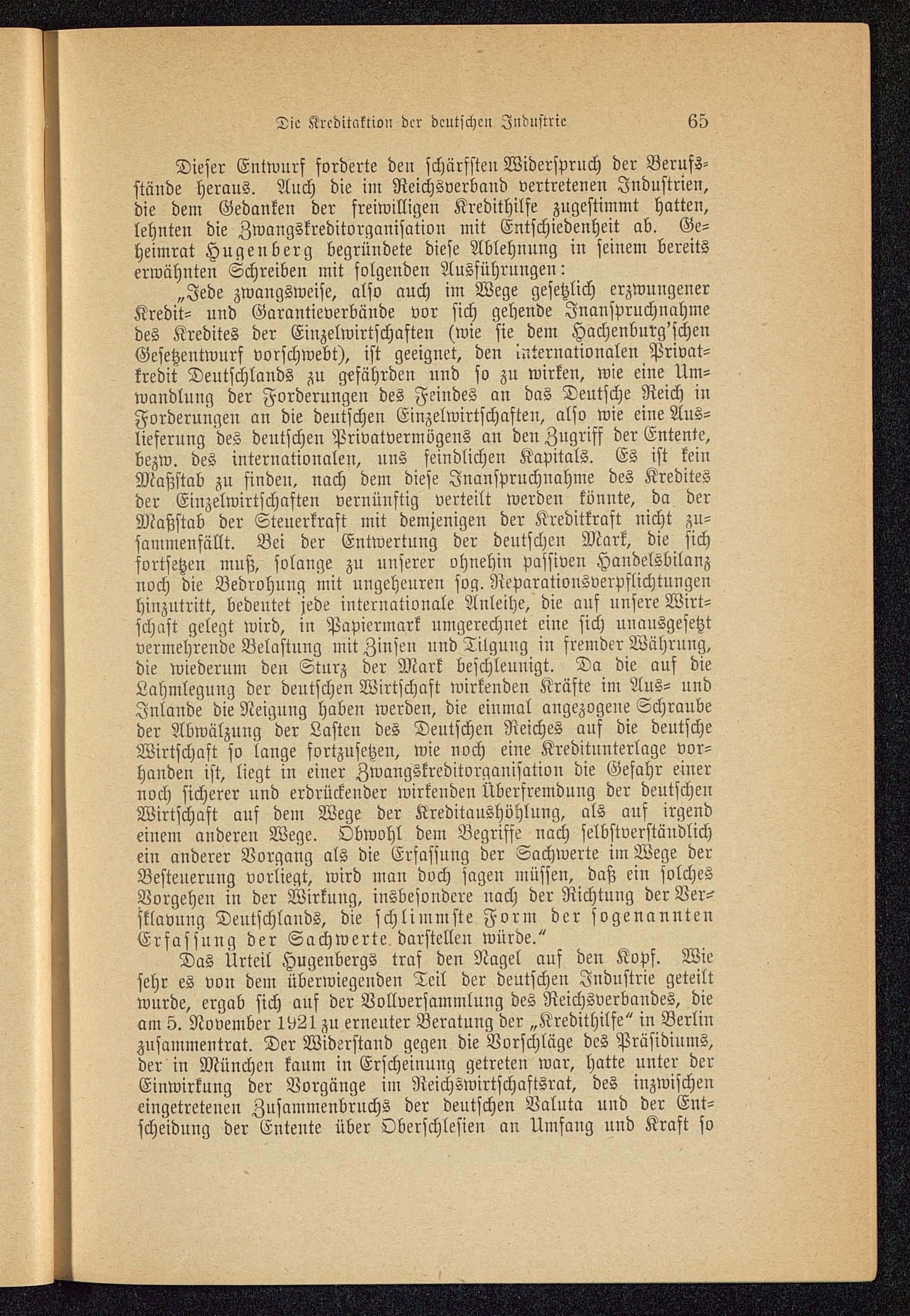 Dieser Entwurf forderte den schärfsten Widerspruch der Berufs-stände heraus. Auch die im Reichsverband vertretenen Industrien,die dem Gedanken der freiwilligen Kredithilfe zugestimmt hatten,lehnten die Zwangskreditorganisation mit Entschiedenheit ab. Ge-heimrat Hugenberg begründete diese Ablehnung in seinem bereitserwähnten Schreiben mit folgenden Ausführungen: