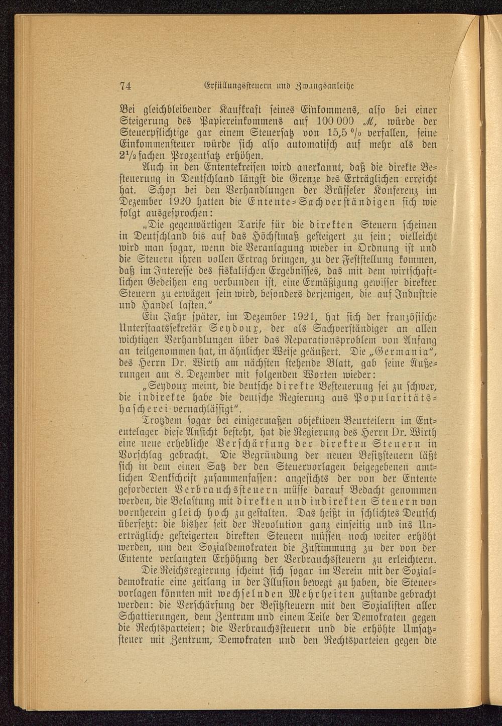 Trotzdem sogar bei einigermaßen objektiven Beurteilern im Ent-entelager diese Ansicht besteht, hat die Regierung des Herrn Dr. Wirtheine neue erhebliche Verschärfung der direkten Steuern inVorschlag gebracht. Die Begründung der neuen Besitzsteuern läßtsich in dem einen Satz der den Stenervorlagen beigegebenen amt-lichen Denkschrift zusammenfassen: angesichts der von der Ententegeforderten Verbrauchssteuern müsse darauf Bedacht genommenwerden, die Belastung mit direkten und indirekten Steuern vonvornherein gleich hoch zu gestalten. Das heißt in schlichtes Deutschübersetzt: die bisher seit der Revolution ganz einseitig und ins Un-erträgliche gesteigerten direkten Steuern müssen noch weiter erhöhtwerden, um den Sozialdemokraten die Zustimmung zu der von derEntente verlangten Erhöhung der Verbrauchssteuern zu erleichtern.