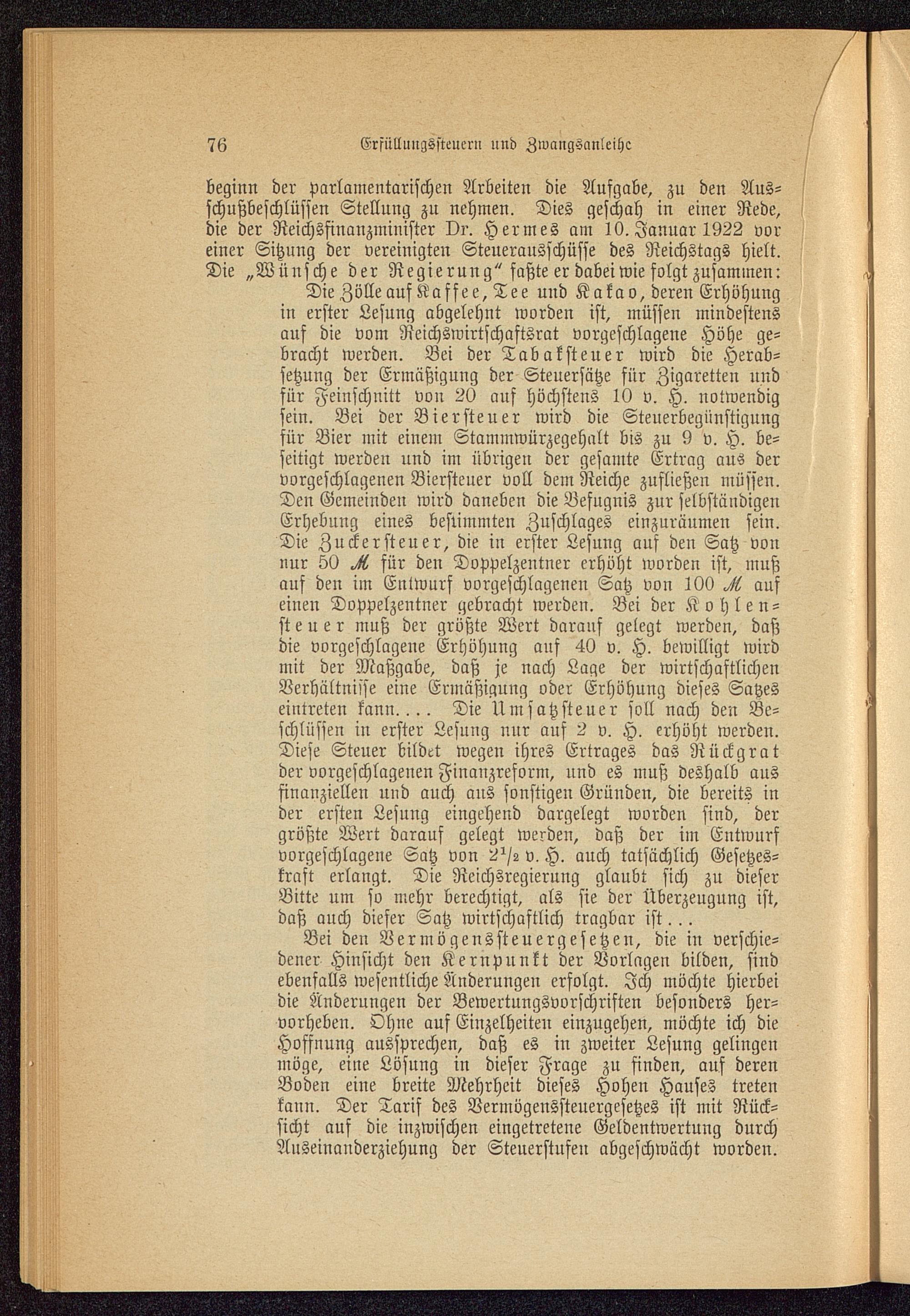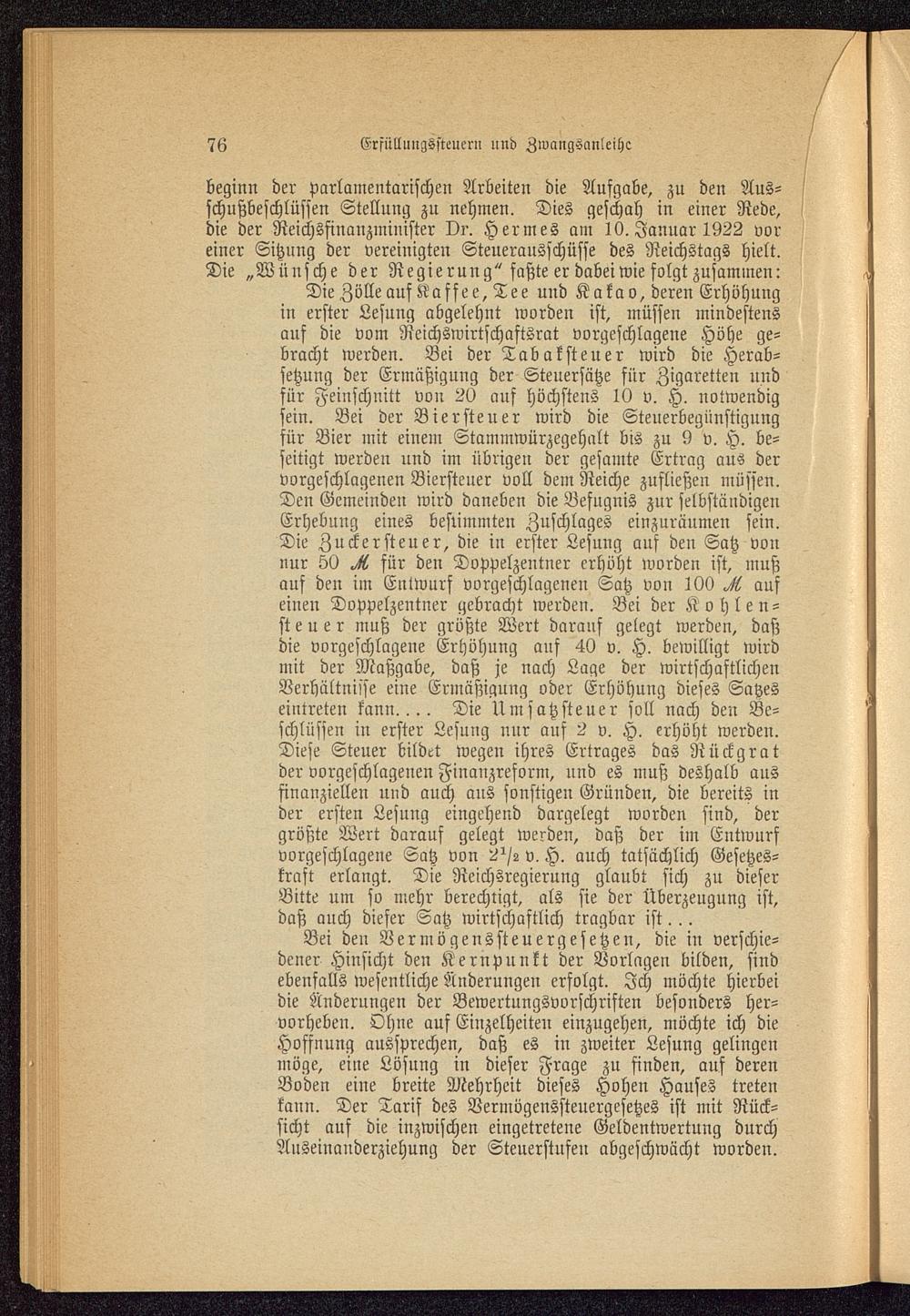 beginn der parlamentarischen Arbeiten die Aufgabe, zu den Aus-schußbeschlüssen Stellung zu nehmen. Dies geschah in einer Rede,die der Reichsfinanzminister Dr. Hermes am 10. Januar 1922 voreiner Sitzung der vereinigten Steuerausschüsse des Reichstags hielt.Die „Wünsche der Regierung" faßte er dabeiwie folgt zusammen:Die Zölle auf Kaffee, Tee uud Kakao, deren Erhöhungin erster Lesung abgelehnt worden ist, müssen mindestensauf die vom Reichswirtschaftsrat vorgeschlagene Höhe ge-bracht werden. Bei der Tabaksteuer wird die Herab-setzung der Ermäßigung der Steuersätze für Zigaretten undfür Feinschnitt von 20 auf höchstens 10 v. H. notwendigsein. Bei der Biersteuer wird die Steuerbegünstigungfür Bier mit einem Stammwürzegehalt bis zu 9 v. H. be-seitigt werden und im übrigen der gesamte Ertrag aus dervorgeschlagenen Biersteuer voll dem Reiche zufließen müssen.Den Gemeinden wird daneben die Befugnis zur selbständigenErhebung eines bestimmten Zuschlages einzuräumen sein.Die Zuckersteuer, die in erster Lesung auf den Satz vonnur 50 ^ für den Doppelzentner erhöht worden ist, mußauf den im Entwurf vorgeschlagenen Satz von 100 aufeinen Doppelzentner gebracht werden. Bei der Kohlen-steuer muß der größte Wert darauf gelegt werden, daßdie vorgeschlagene Erhöhung auf 40 v. H. bewilligt wirdmit der Maßgabe, daß je nach Lage der wirtschaftlichenVerhältnisse eine Ermäßigung oder Erhöhung dieses Satzeseintreten kann.... Die Umsatzsteuer soll nach den Be-schlüssen in erster Lesung nur auf 2 v. H. erhöht werden.Diese Steuer bildet wegen ihres Ertrages das Rückgratder vorgeschlagenen Finanzreform, nnd es muß deshalb ausfinanziellen und auch ans sonstigen Gründen, die bereits inder ersten Lesung eingehend dargelegt worden sind, dergrößte Wert darauf gelegt werden, daß der im Entwurfvorgeschlagene Satz von 2^2 v. H. auch tatsächlich Gesetzes-kraft erlangt. Die Reichsregierung glaubt sich zu dieserBitte um so mehr berechtigt, als sie der Überzeugung ist,daß auch dieser Satz wirtschaftlich tragbar ist...