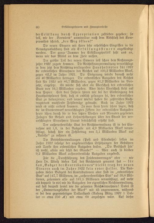 Für die „Durchführung des Friedensvertrages" oder — wieHerr Dr. Wirth diesen Teil des Reichsetats genannt hat — fürdas„Budget derKontributionen" bleibt trotz der neuenSteuern auch im Jahre 1922 kein roter Heller. Die Aus-gaben dieses Budgets der Kontributionen aber sind im „ordentlichenEtat" auf 147,7 Millionen, im „außerordentlichen Etat" auf 39,8 Mil-lionen, zusammen also auf 187,5 Millionen veranschlagt, auf mehrals doppelt fo viel wie die Ausgaben der eigentlichen Neichsverwaltung,auf fast doppelt soviel wie die gesamten Reichseinnahmen! Dabei istder „Entwertungsfaktor der Mark" mit 45 angenommen, währender bei dein gegenwärtigen Dollarstand (Anfang März 1922 1 Dol-lar — etwa 250 ^) mit etwa 60 anzusetzen wäre. Auf dieser