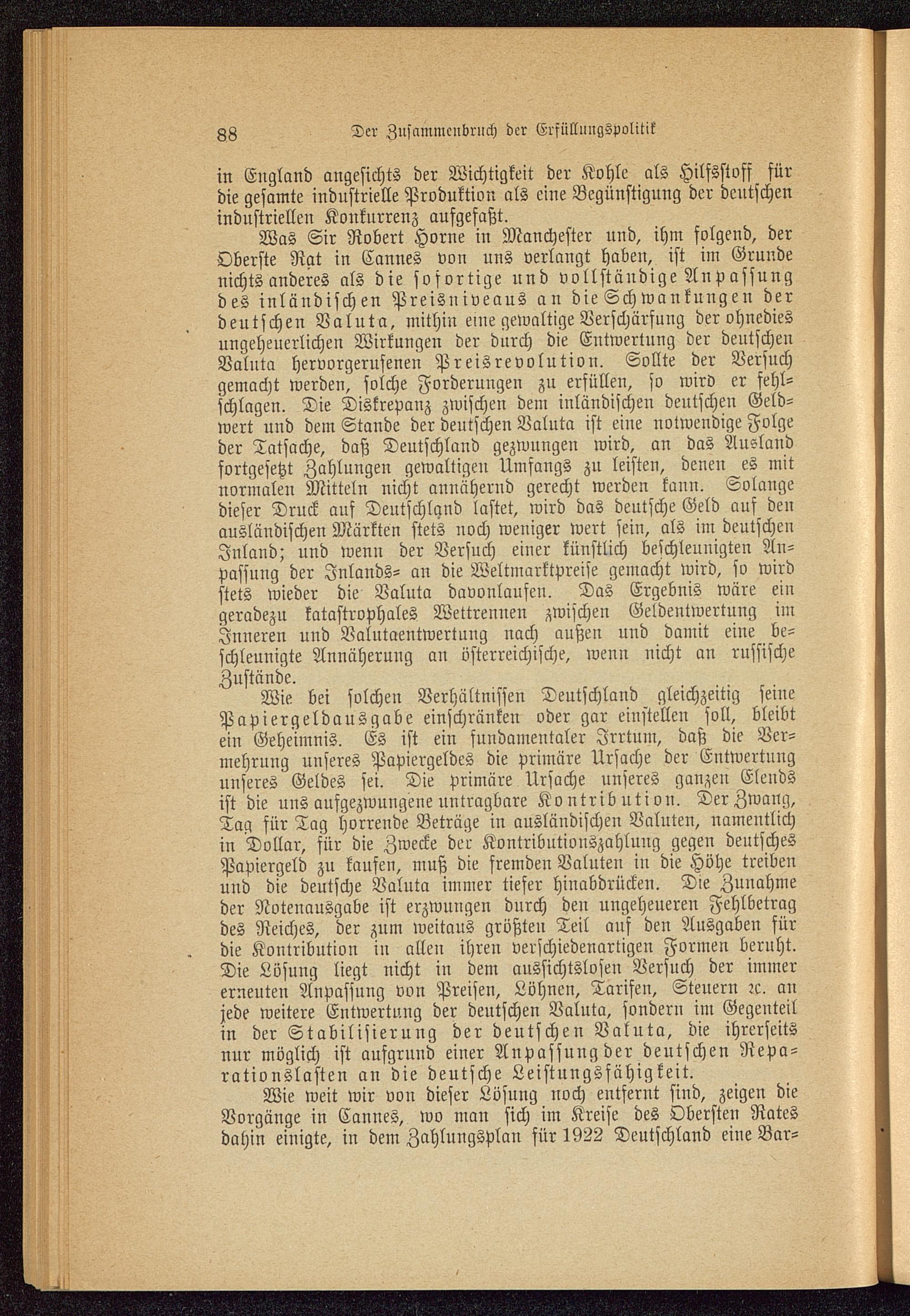Was Sir Robert Hörne in Manchester und, ihm folgend, derOberste Rat in Cannes von uns verlangt haben, ist im Grundenichts anderes als die sofortige und vollständige Anpassungdes inländischen Preisniveaus an die Sch wankungeu derdeutscheu Valuta, mithin eine gewaltige Verschärfung der ohnediesungeheuerlichen Wirkungen der durch die Entwertung der deutschen Valuta hervorgerufenen Preisrevolution. Sollte der Versuchgemacht werden, solche Forderungen zu erfüllen, so wird er fehl-schlagen. Die Diskrepanz zwischen dem inländischen deutschen Geld-wert und dem Stande der deutschen Valuta ist eine notwendige Folgeder Tatsache, daß Deutschland gezwungen wird, an das Auslandfortgesetzt Zahlungen gewaltigen Umfangs zu leisten, denen es mitnormalen Mitteln nicht annähernd gerecht werden kann. Solangedieser Druck auf Deutschland lastet, wird das deutsche Geld auf denausländischen Märkten stets noch weniger wert sein, als im deutschen Inland; und wenn der Versuch einer künstlich beschleunigten An-passung der Inlands- an die Weltmarktpreise gemacht wird, so wirdstets wieder die Valuta davonlaufen. Das Ergebnis wäre eingeradezu katastrophales Wettrennen zwischen Geldentwertung imInneren und Valutaentwertung nach außen und damit eine be-schleunigte Annäherung an österreichische, wenn nicht an russischeZustände.