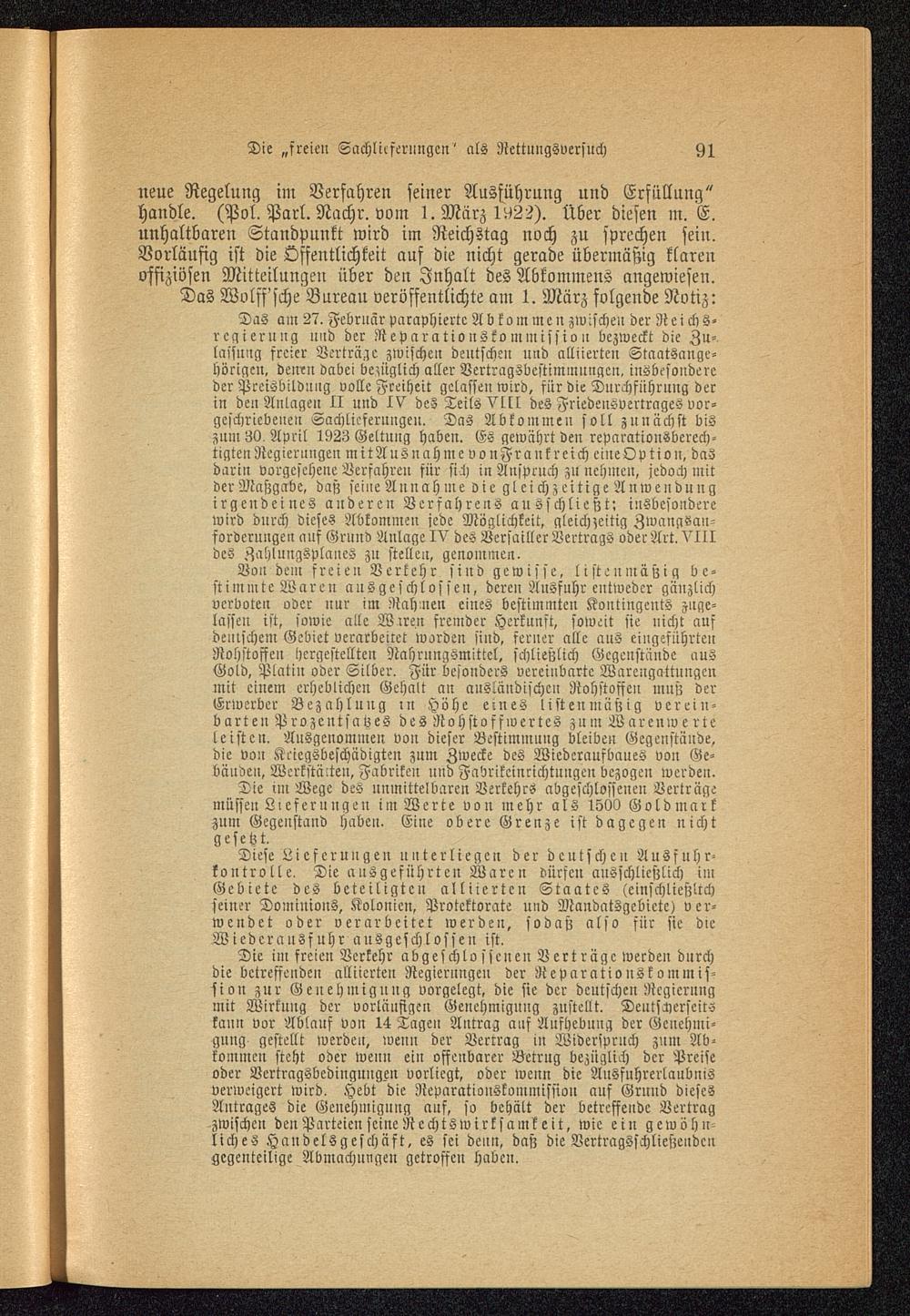 neue Regelung im Verfahren seiner Ausführung und Erfüllung"handle. (Pol. Parl. Nachr. vom I.März 1^22). Über diesen m. E.unhaltbaren Standpunkt wird im Reichstag noch zu sprechen sein.Vorläufig ist die Öffentlichkeit auf die nicht gerade übermäßig klarenoffiziösen Mitteilungen über den Inhalt des Abkommens angewiesen.Das Wolff'sche Bnreau veröffentlichte am 1. März folgende Notiz: