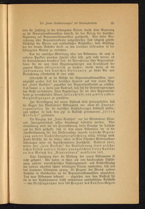 Eine Täuschung über die Wirkung des neuen Abkommens istnicht gestattet. Wir haben es schon als eine katastrophale Schädi-gung unserer unentbehrlichen Nahrungsmittel- und Rohstoffbezügewie unserer ohnedies schwer bedrängten Valuta empfunden, daß unsdas Londoner Ultimatum zwang, 25 Prozent des Wertes unsererAusfuhr in Golddevisen an die Reparationskonimission abzuliefern.Das neue Abkommen bedeutet — abgesehen von dem Nachlaß fürdie in den Ausfuhrwaren selbst enthaltenen ausländischen Rohstoffe— eine Beschlagnahme vo n 100 Prozent des Devisen-Gegen-