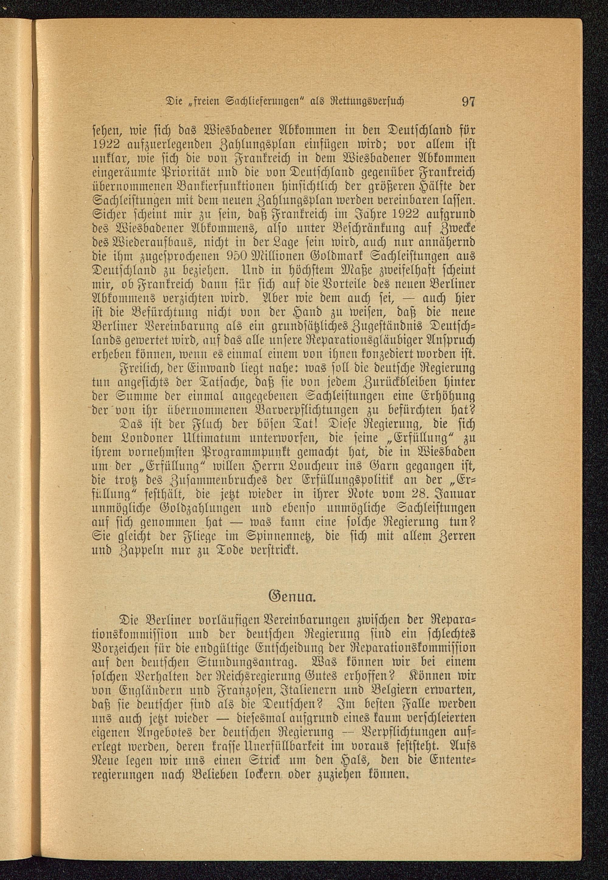 Freilich, der Einwand liegt nahe: was soll die deutsche Regierungtun angesichts der Tatsache, daß sie von jedem Zurückbleiben hinterder Summe der einmal angegebenen Sachleistungen eine Erhöhungder von ihr übernommenen Barverpflichtungen zu befürchten hat?
