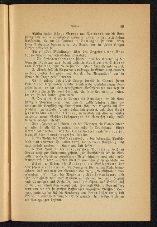 1. Die Friedensverträge scheiden aus der Erörterung derGenueser Konferenz aus; damit auch die Revision des Diktatesvon Versailles, ohne die es für Deutschland keine Gesundung gibt.
