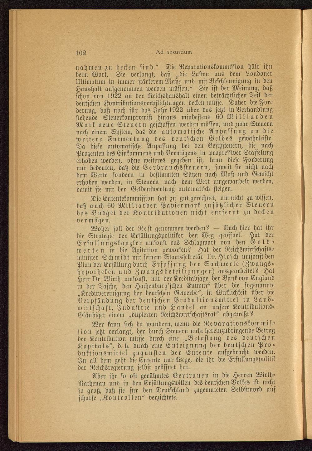 Die Ententekommission hat zn gut gerechnet, um nicht zu wissen,daß auch 60 Milliarden Papiermark zusätzlicher Steuerndas Budget der Kontributionen nicht entfernt zu deckenvermögen.