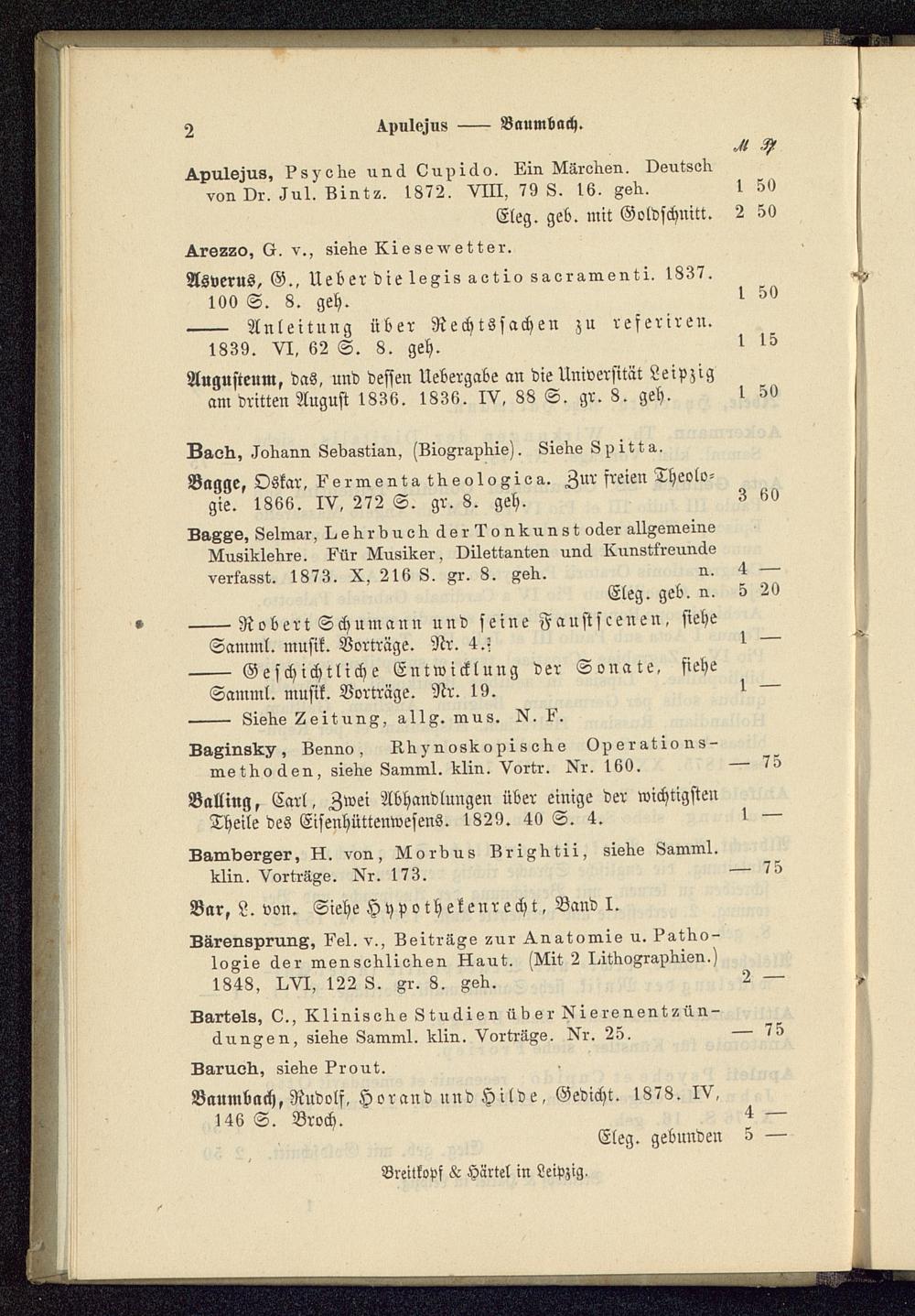 Bach, Johann Sebastian,( Biographie). Siehe Spitta.Bagge, Ostar, Fermenta theologica. Zur freien Theologie. 1866. IV, 272 S. gr. 8. geb.Bagge, Selmar, Lehrbuch der Tonkunst oder allgemeineMusiklehre. Für Musiker, Dilettanten und Kunstfreundeverfasst. 1873. X, 216 S. gr. 8. geh.
