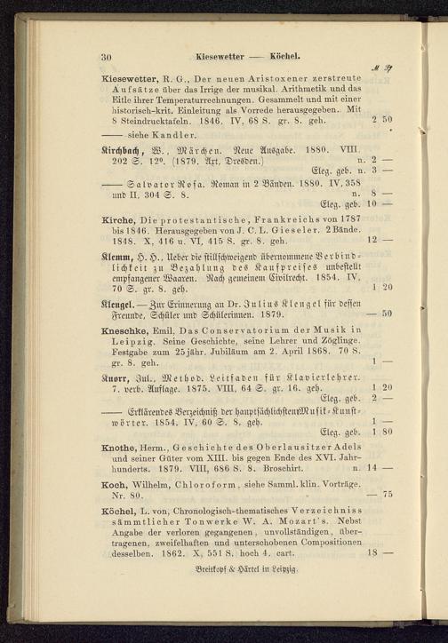 Köchel, L. von, Chronologisch- thematisches Verzeichnisssämmtlicher Tonwerke W. A. Mozart's. NebstAngabe der verloren gegangenen, unvollständigen, über-tragenen, zweifelhaften und unterschobenen Compositionen iodesselben. 1862. X, 551 S. hoch 4. cart.
