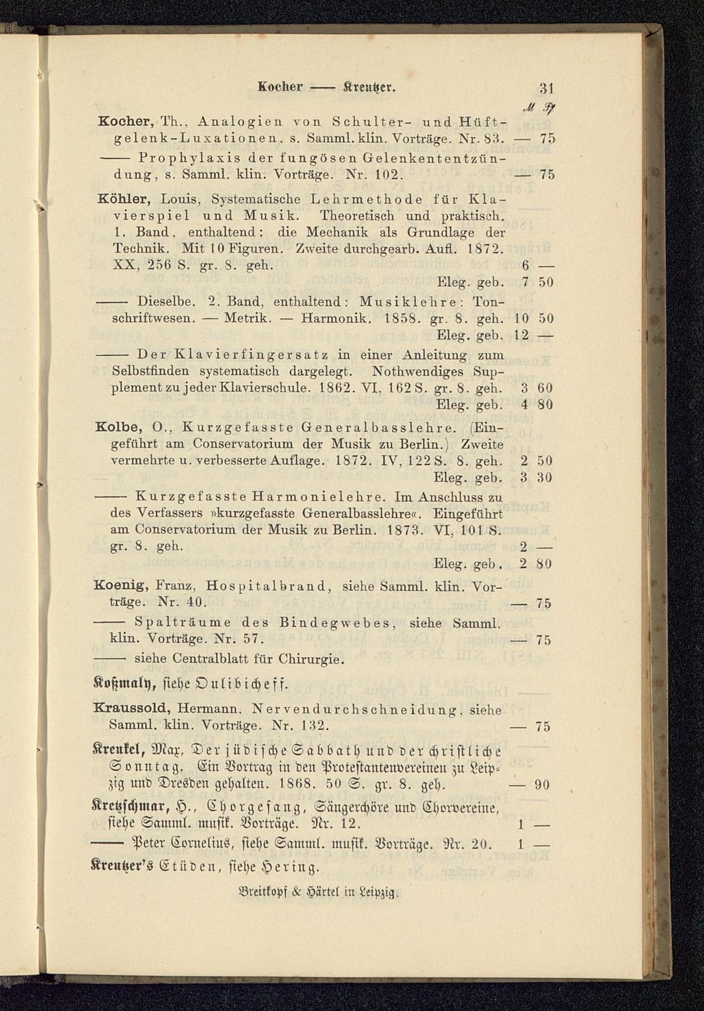 Köhler, Louis, Systematische Lehrmethode für Kla-vierspiel und Musik. Theoretisch und praktisch.1. Band, enthaltend: die Mechanik als Grundlage derTechnik. Mit 10 Figuren. Zweite durchgearb. Aufl. 1872.XX, 256 S. gr. 8. geh.