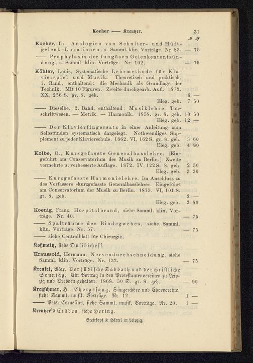 Kolbe, O., Kurzgefasste Generalbasslehre.( Ein-geführt am Conservatorium der Musik zu Berlin.) Zweitevermehrte u. verbesserte Auflage. 1872. IV, 122 S. 8. geh.Eleg. geb.