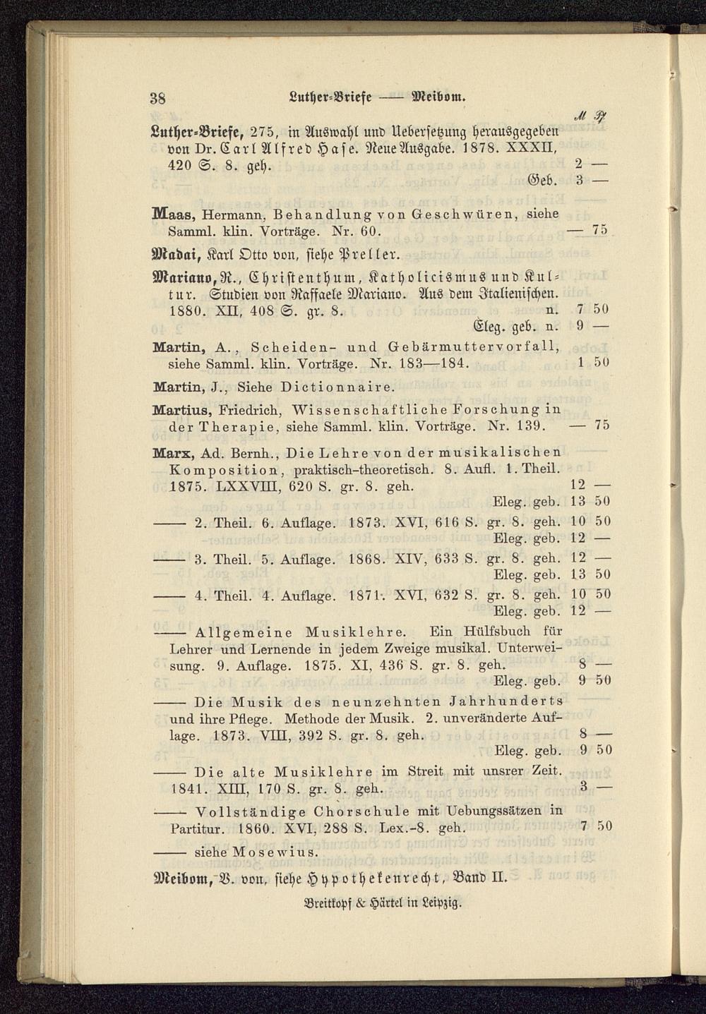 Martius, Friedrich, Wissenschaftliche Forschung inder Therapie, siehe Samml. klin. Vorträge. Nr. 139.Marx, Ad. Bernh., Die Lehre von der musikalischenKomposition, praktisch- theoretisch. 8. Aufl. 1. Theil. I01875. LXXVIII, 620 S. gr. 8. geh.