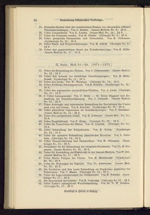 51. Die Resectionen der Gelenke. Von R. Volkmann.( Chirurgie No. 16.) 42 S.52. Ueber Lister's antiseptische Wundbehandlung. Von Dr. A. W. Schultze.( Chirurgie No. 17.) 26 S.