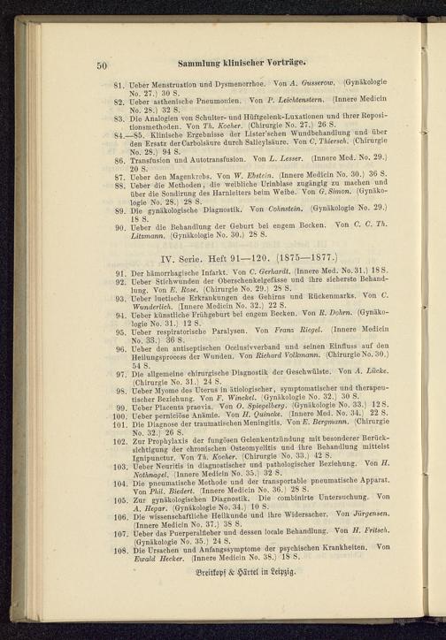 91. Der hämorrhagische Infarkt. Von C. Gerhardt.( Innere Med. No. 31.) 18 S.92. Ueber Stichwunden der Oberschenkelgefässe und ihre sicherste Behand-lung. Von E. Rose.( Chirurgie No. 29.) 28 S.