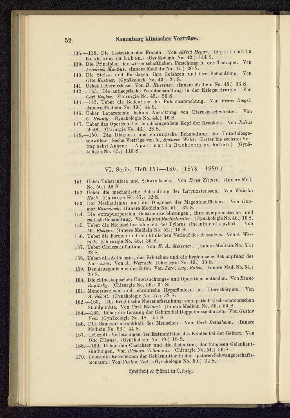 141. Ueber Lebercirrhose. Von B. Kuessner.( Innere Medicin No. 48.) 36 S.142. 143. Die antiseptische Wundbehandlung in der Kriegschirurgie. VonCarl Reyher.( Chirurgie No. 45.) 56 S.
