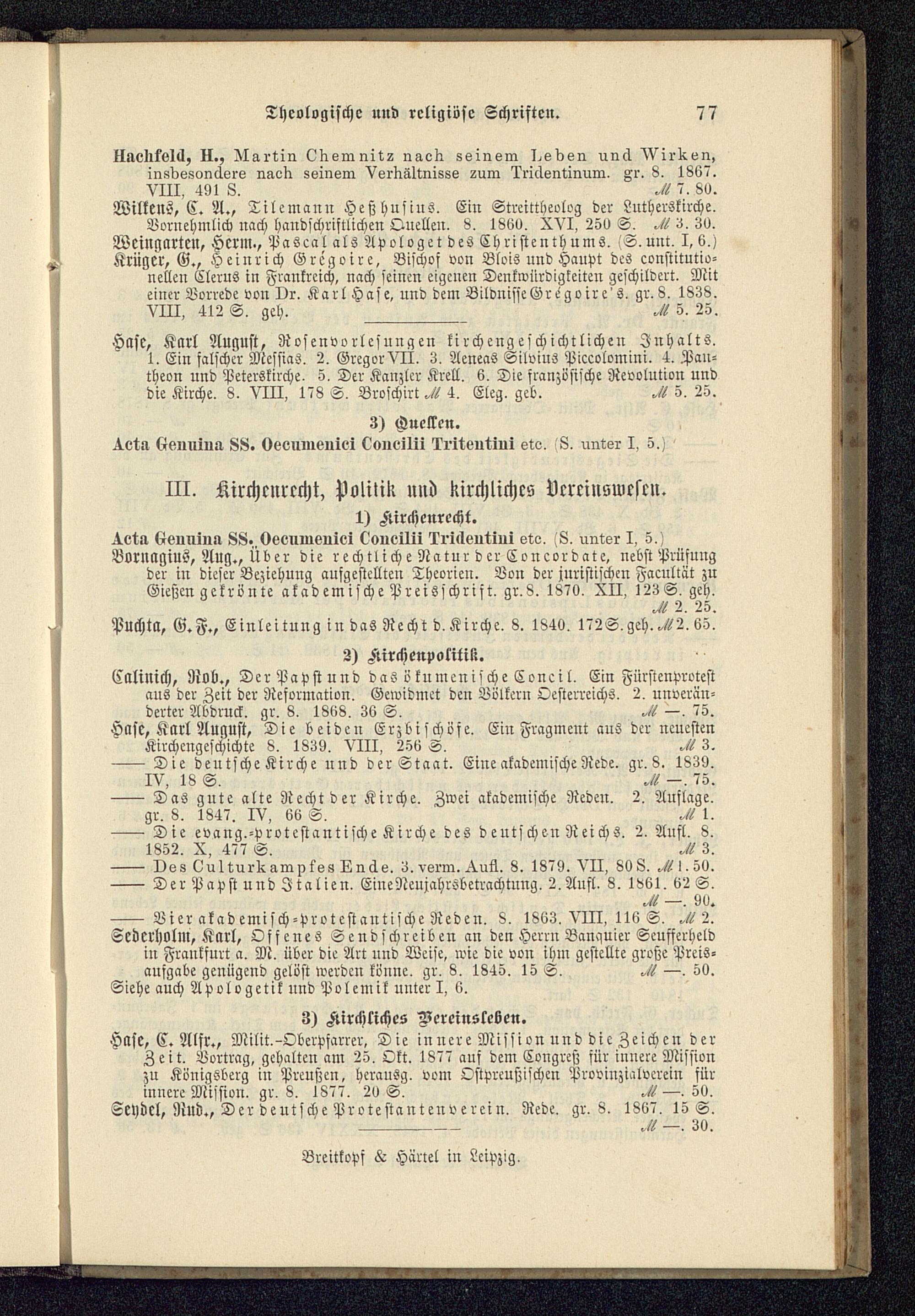 Hase, C. Alfr., Milit.- Oberpfarrer, Die innere Mission und die Zeichen derZeit. Vortrag, gehalten am 25. Okt. 1877 auf dem Congreß für innere Missionzu Königsberg in Preußen, herausg. vom Ostpreußischen Provinzialverein fürinnere Mission . gr. 8. 1877. 20 S.M. 50.Seydel, Rud., Der deutsche Protestantenverein. Rede. gr. 8. 1867. 15 S.M. 30.