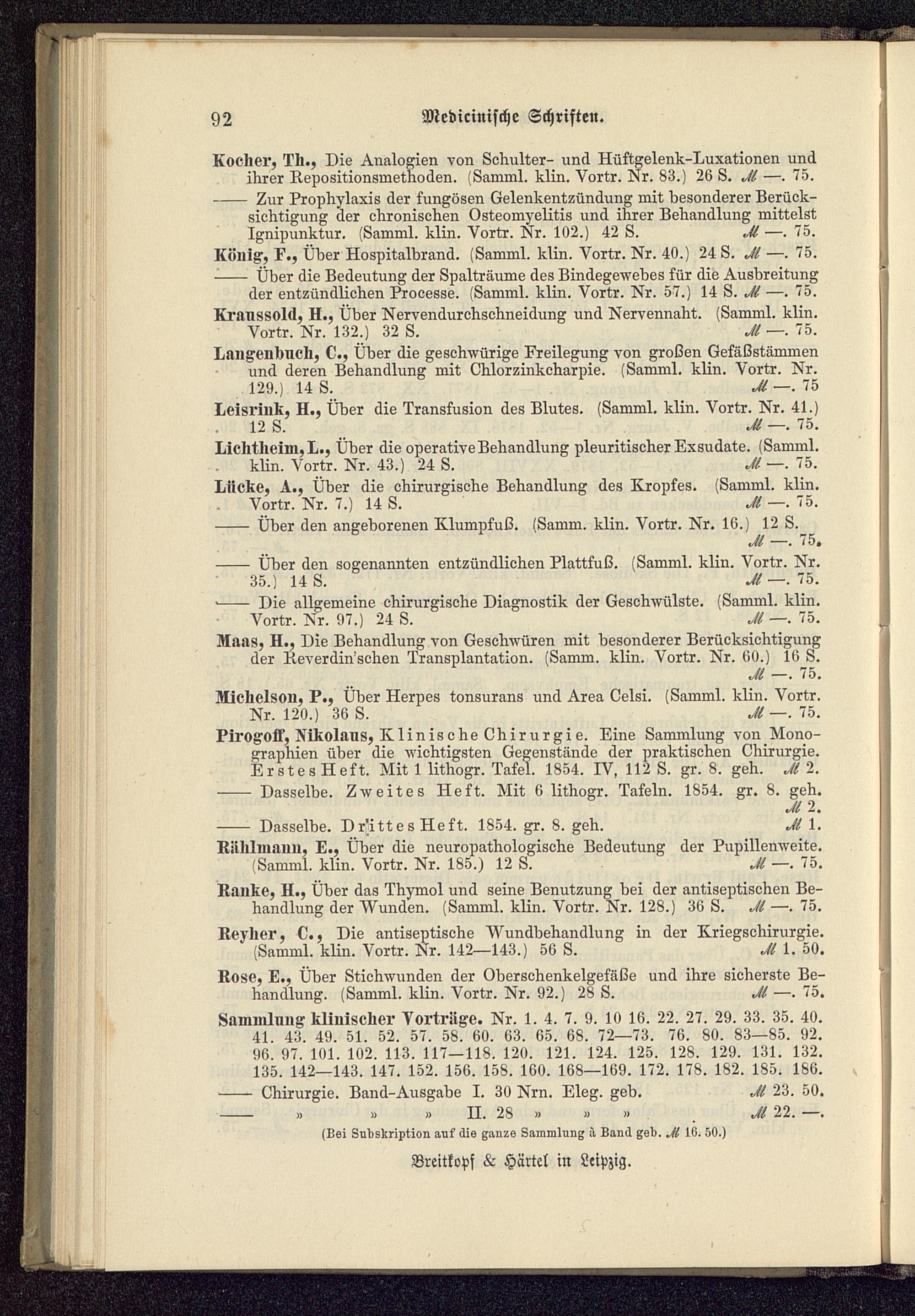 Michelson, P., Über Herpes tonsurans und Area Celsi.( Samml. klin. Vortr.Nr. 120.) 36 S.M. 75.Pirogoff, Nikolaus, Klinische Chirurgie. Eine Sammlung von Mono-graphien über die wichtigsten Gegenstände der praktischen Chirurgie.Erstes Heft. Mit 1 lithogr. Tafel. 1854. IV, 112 S. gr. 8. geh. M 2.Dasselbe. Zweites Heft. Mit 6 lithogr. Tafeln. 1854. gr. 8. geh.
