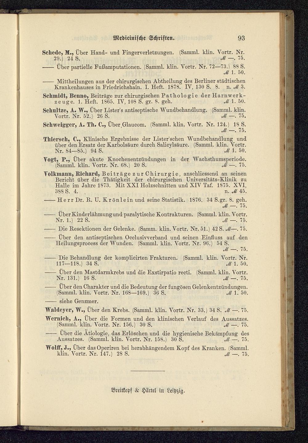 Mittheilungen aus der chirurgischen Abtheilung des Berliner städtischenKrankenhauses in Friedrichshain. I. Heft. 1878. IV, 130 S. 8. n. M 3.Schmidt, Benno, Beiträge zur chirurgischen Pathologie der Harnwerk-zeuge. 1. Heft. 1865. IV, 108 S. gr. 8. geh.Schultze, A. W., Über Lister's antiseptische Wundbehandlung.( Samml. klin.Vortr. Nr. 52.) 26 S.