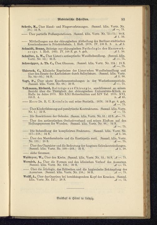M- 75.Die Resektionen der Gelenke.( Samm. klin. Vortr. Nr. 51.) 42 S. M. 75.Über den antiseptischen Occlusivverband und seinen Einfluss auf denHeilungsprocess der Wunden.( Samml. klin. Vortr. Nr. 96.) 54 S.