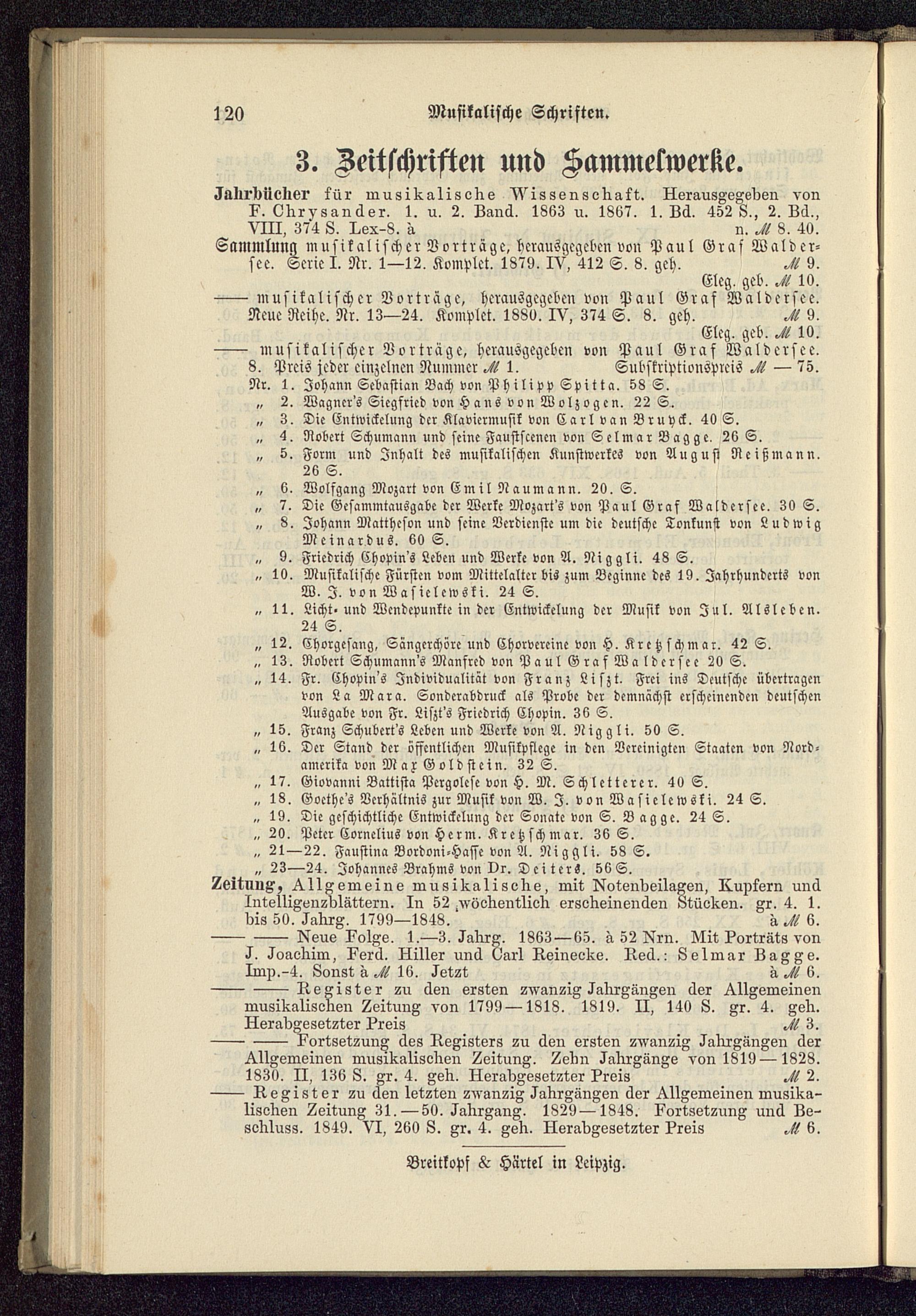 Jahrbücher für musikalische Wissenschaft. Herausgegeben vonF. Chrysander. 1. u. 2. Band. 1863 u. 1867. 1. Bd. 452 S., 2. Bd.,VIII, 374 S. Lex- 8. àSammlung musikalischer Vorträge, herausgegeben von Paulsee. Serie I. Nr. 1-12. Komplet. 1879. IV, 412 S. 8. geh.