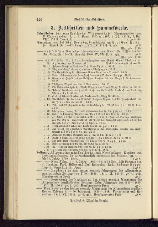 - Neue Folge. 1.- 3. Jahrg. 1863-65. à 52 Nrn. Mit Porträts vonJ. Joachim, Ferd. Hiller und Carl Reinecke. Red.: Selmar Bagge.Imp.- 4. Sonst à M 16. Jetztà M 6.Register zu den ersten zwanzig Jahrgängen der Allgemeinen.musikalischen Zeitung von 1799-1818. 1819. II, 140 S. gr. 4. geh.Herabgesetzter Preis