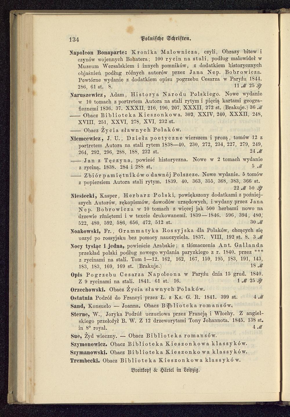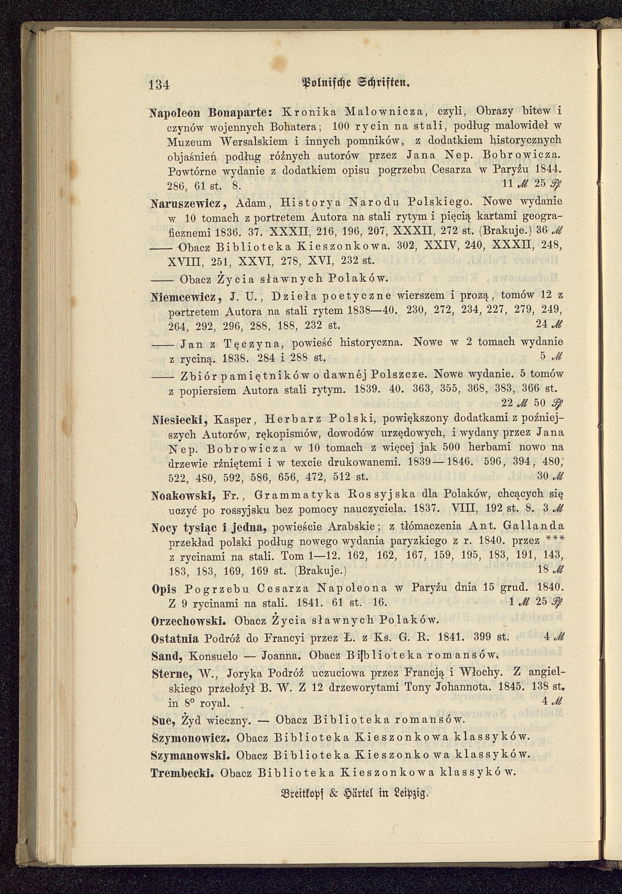 *** 5 MZbiór pamiętników o dawnéj Polszcze. Nowe wydanie. 5 tomówz popiersiem Autora stali rytym. 1839. 40. 363, 355, 368, 383, 366 st.ignA outölg22 M 50Niesiecki, Kasper, Herbarz Polski, powiększony dodatkami z poźniej-szych Autorów, rękopismów, dowodów urzędowych, i wydany przez JanaNep. Bobrowicza w 10 tomach z więcej jak 500 herbami nowo nadrzewie rżniętemi i w texcie drukowanemi. 1839-1846. 596, 394, 480,522, 480, 592, 586, 656, 472, 512 st.Led 30 MNoakowski, Fr., Grammatyka Rossyjska dla Polaków, chcących sięuczyć po rossyjsku bez pomocy nauczyciela. 1837. VIII, 192 st. 8. 3 MNocy tysiąc i jedna, powieście Arabskie; z tłómaczenia Ant. Gallandaprzekład polski podług nowego wydania paryzkiego z r. 1840. przezz rycinami na stali. Tom 1-12. 162, 162, 167, 159, 195, 183, 191, 143,183, 183, 169, 169 st.( Brakuje.)18 AlOpis Pogrzebu Cesarza Napoleona w Paryżu dnia 15 grud. 1840.Z 9 rycinami na stali. 1841. 61 st. 16.do 1 M 25 POrzechowski. Obacz Życia sławnych Polaków.dia sosdoOstatnia Podróż do Francyi przez L. z Ks. G. R. 1841. 399 st.Sand, Konsuelo Joanna. Obacz Biblioteka romansów.Sterne, W., Joryka Podróż uczuciowa przez Francją i Włochy. Z angiel-skiego przełożył B. W. Z 12 drzeworytami Tony Johannota. 1845.in 8° royal.