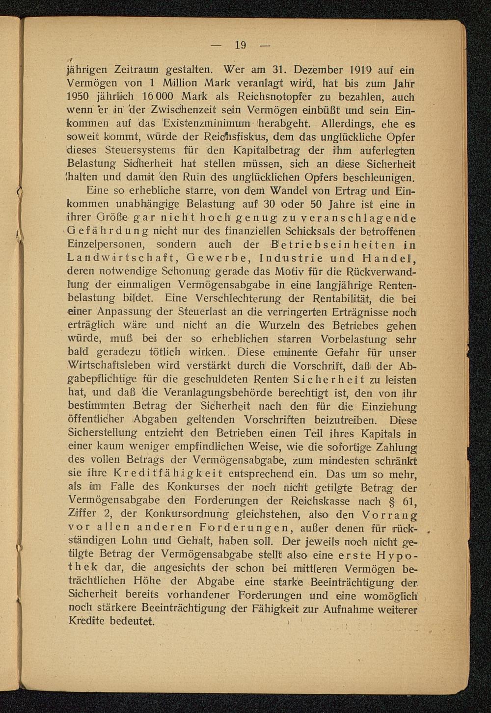 jährigen Zeitraum gestalten. Wer am 31. Dezember 1919 auf einVermögen von 1 Million Mark veranlagt wird, hat bis zum Jahr1950 jährlich 16 000 Mark als Reichsnotopfer zu bezahlen, auchwenn "er in 'der Zwischenzeit sein Vermögen einbüßt und sein Ein-kommen auf das Existenzminimum herabgeht. Allerdings, ehe essoweit kommt, würde der Reiclisfiskus, dem das unglückliche Opferdieses Steuersystems für den Kapitalbetrag der ihm auferlegtenBelastung Sicherheit hat stellen müssen, sich an diese Sicherheit(halten und damit den Ruin des unglücklichen Opfers beschleunigen.
