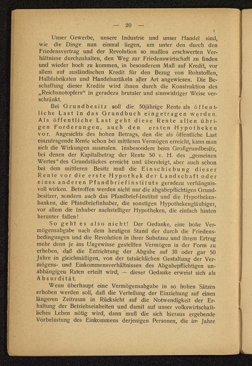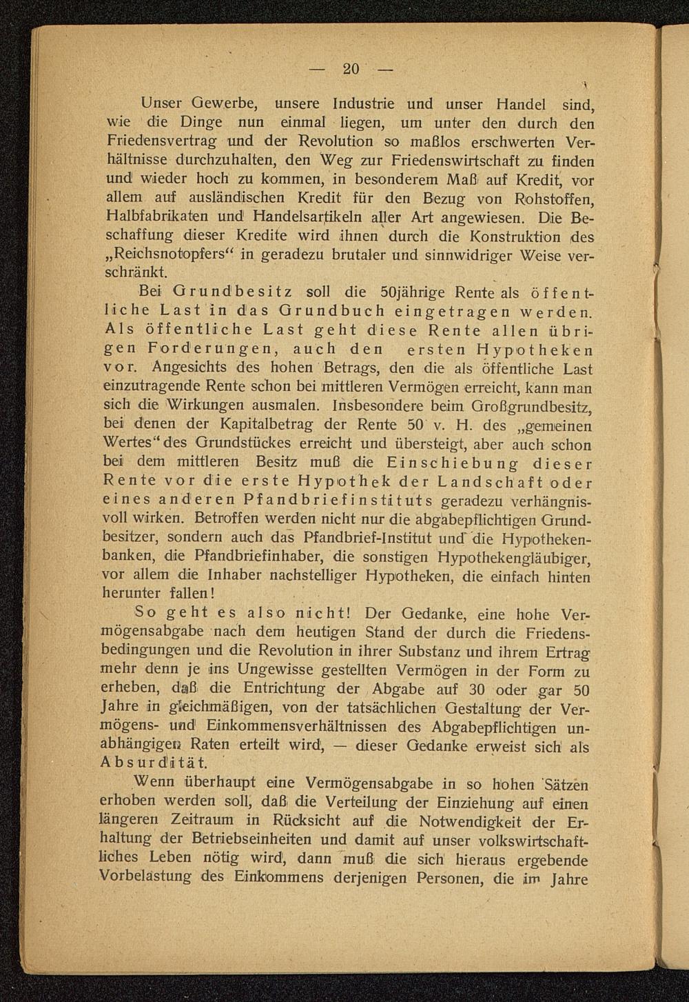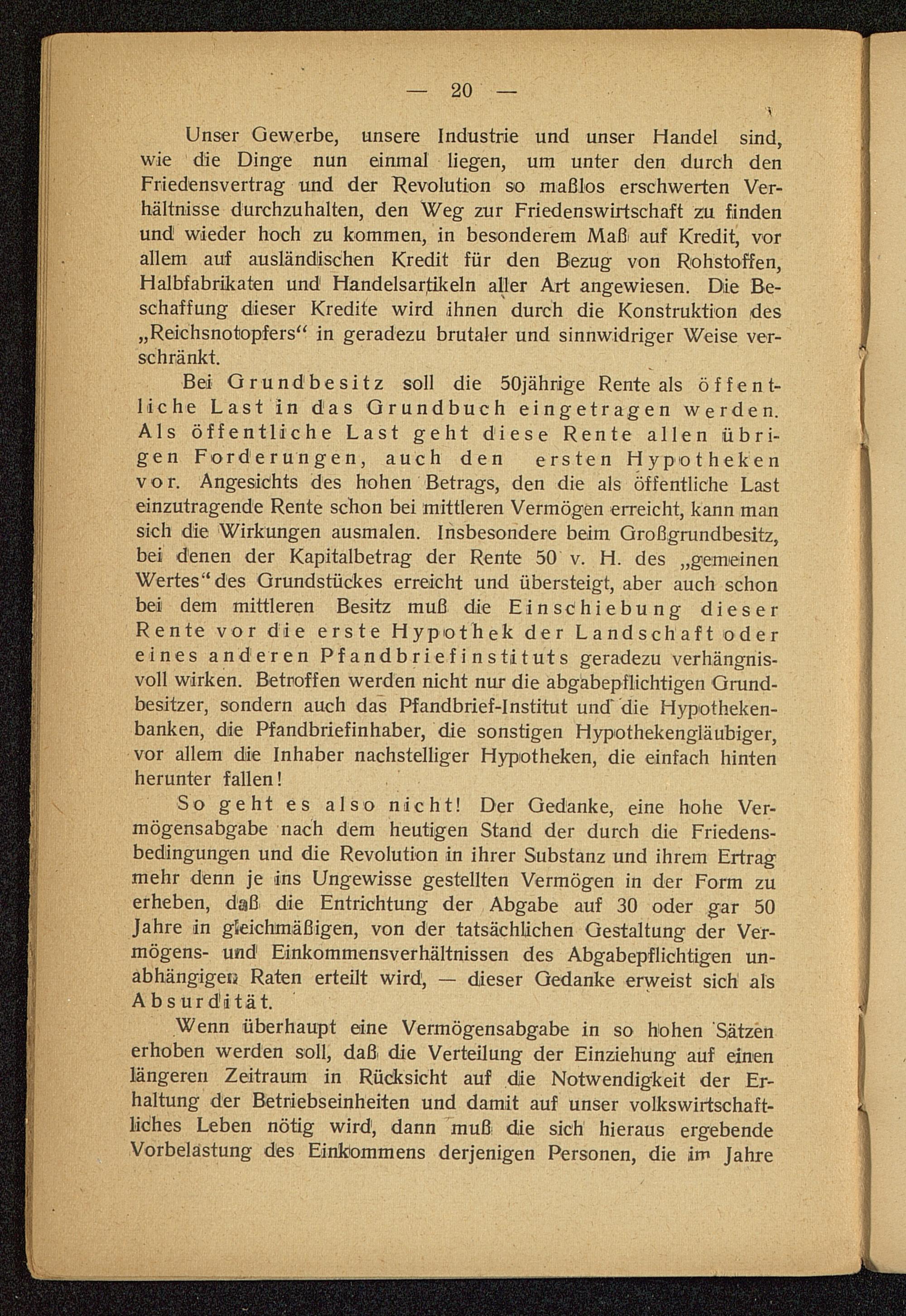 Unser Gewerbe, unsere Industrie und unser Handel sind,wie die Dinge nun einmal liegen, um unter den durch denFriedensvertrag und der Revolution so maßlos erschwerten Ver-hältnisse durchzuhalten, den Weg zur Friedenswirtschaft zu findenund wieder hoch zu kommen, in besonderem Maß auf Kredit, vorallem auf ausländischen Kredit für den Bezug von Rohstoffen,Halbfabrikaten und Handelsartikeln aller Art angewiesen. Die Be-schaffung dieser Kredite wird ihnen durch die Konstruktion des„Reichsnotopfers" in geradezu brutaler und sinnwidriger Weise ver-schränkt.