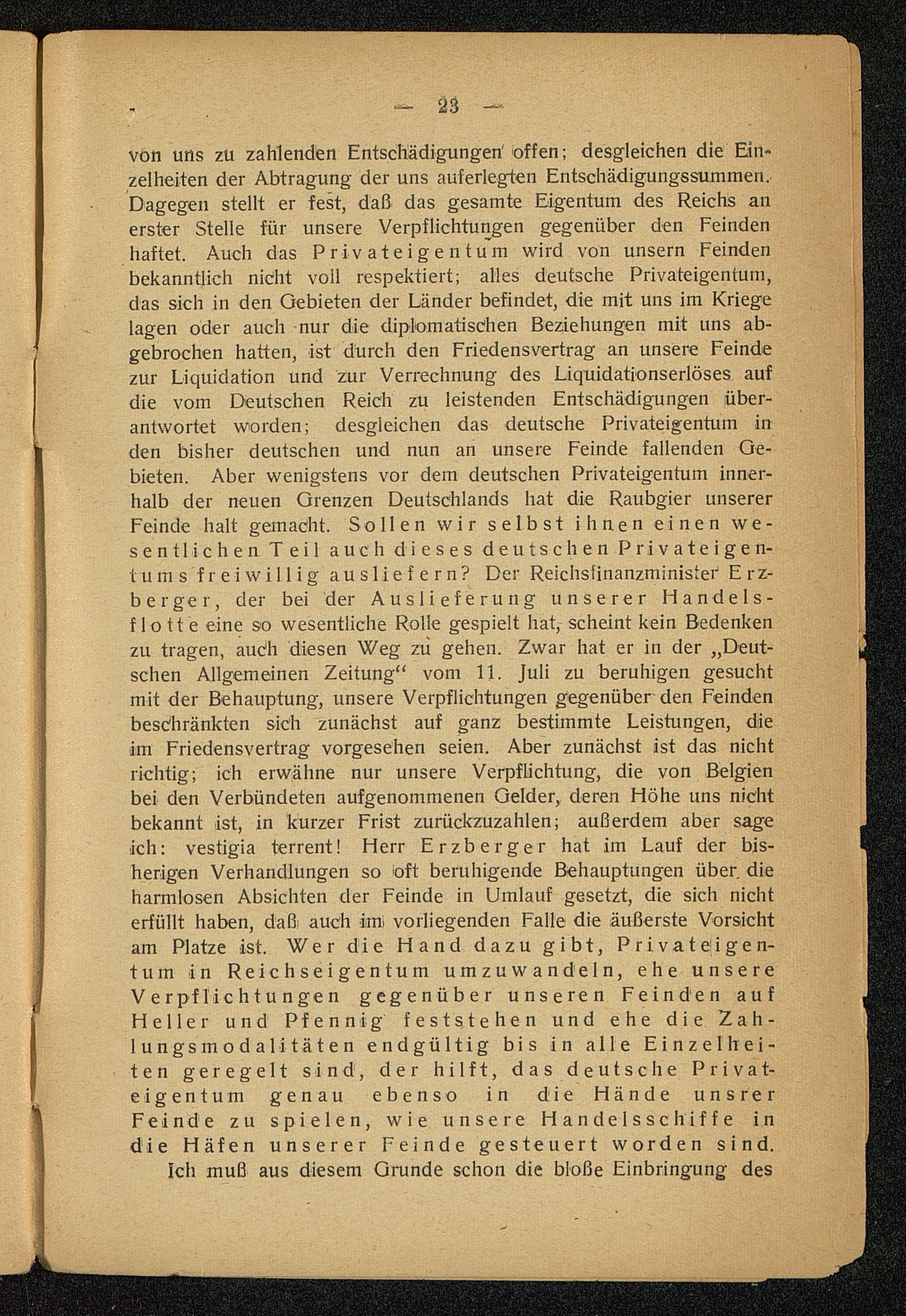 von uns zu zahlenden Entschädigungen' offen; desgleichen die Ein-zelheiten der Abtragung der uns auferlegten Entschädigungssummen.Dagegen stellt er fest, daß das gesamte Eigentum des Reichs anerster Stelle für unsere Verpflichtungen gegenüber den Feindenhaftet. Auch das Privateigentum wird von unsern Feindenbekanntlich nicht voll respektiert; alles deutsche Privateigentum,das sich in den Gebieten der Länder befindet, die mit uns im Kriegelagen oder auch nur die diplomatischen Beziehungen mit uns ab-gebrochen hatten, ist durch den Friedensvertrag an unsere Feindezur Liquidation und zur Verrechnung des Liquidationserlöses aufdie vom Deutschen Reich zu leistenden Entschädigungen über-antwortet worden; desgleichen das deutsche Privateigentum inden bisher deutschen und nun an unsere Feinde fallenden Ge-bieten. Aber wenigstens vor dem deutschen Privateigentum inner-halb der neuen Grenzen Deutschlands hat die Raubgier unsererFeinde halt gemacht. Sollen wir selbst ihnen einen we-sentlichen Teil auch dieses deutschen Privateigen-tums freiwillig ausliefern? Der Reichsfinanzminister 1 Erz-berger, der bei der Auslieferung unserer Handels-flotte eine so wesentliche Rolle gespielt hat, scheint kein Bedenkenzu tragen, auch diesen Weg zu gehen. Zwar hat er in der „Deut-schen Allgemeinen Zeitung" vom 11. Juli zu beruhigen gesuchtmit der Behauptung, unsere Verpflichtungen gegenüber den Feindenbeschränkten sich zunächst auf ganz bestimmte Leistungen, dieim Friedensvertrag vorgesehen seien. Aber zunächst ist das nichtrichtig; ich erwähne nur unsere Verpflichtung, die von Belgien bei den Verbündeten aufgenommenen Gelder, deren Höhe uns nichtbekannt ist, in kurzer Frist zurückzuzahlen; außerdem aber sageich: vestigia terrent! Herr Erzberger hat im Lauf der bis-herigen Verhandlungen so oft beruhigende Behauptungen über dieharmlosen Absichten der Feinde in Umlauf gesetzt, die sich nichterfüllt haben, daßi auch im! vorliegenden Falle die äußerste Vorsichtam Platze ist. Wer die Hand dazu gibt, Privateigen-tum in Reichseigentum umzuwandeln, ehe unsereVerpflichtungen gegenüber unseren Feinden aufHeller und Pfennig feststehen und ehe die Zah-lungsmodalitäten endgültig bis in alle Einzelhei-ten geregelt sind, der hilft, das deutsche Privat-eigentum genau ebenso in die Hände unsrerFeinde zu spielen, wie unsere Handelsschiffe indie Häfen unserer Feinde gesteuert worden sind.Ich muß aus diesem Grunde schon die bloße Einbringung des