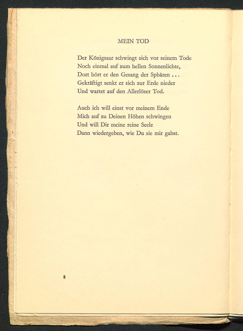 Der Königsaar schwingt sich vor seinem TodeNoch einmal auf zum hellen Sonnenlichte,Dort hört er den Gesang der Sphären ...Gekräftigt senkt er sich zur Erde niederUnd wartet auf den Allerlöser Tod.
