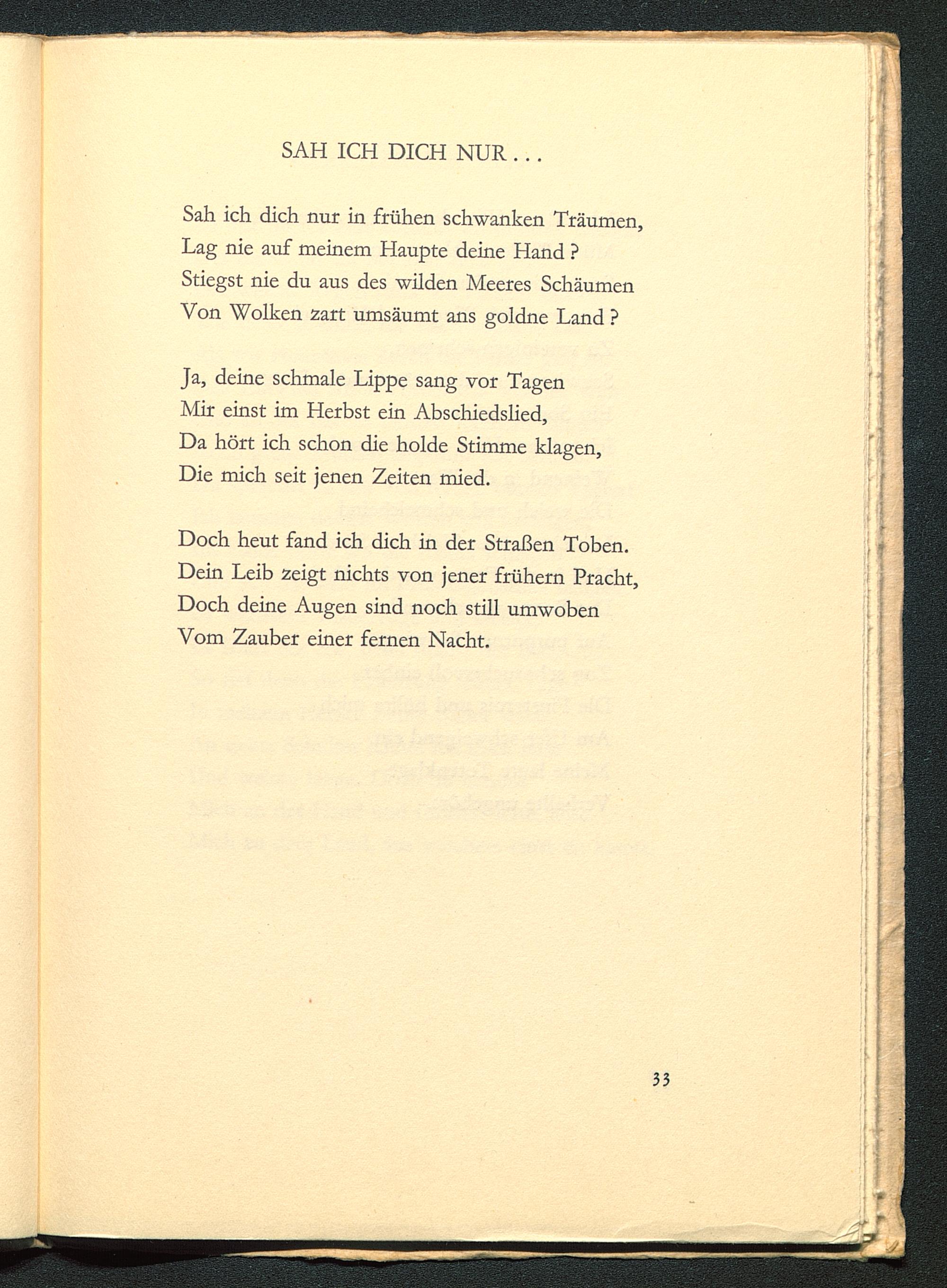 Sah ich dich nur in frühen schwanken Träumen,Lag nie auf meinem Haupte deine Hand ?Stiegst nie du aus des wilden Meeres SchäumenVon Wolken zart umsäumt ans goldne Land ?