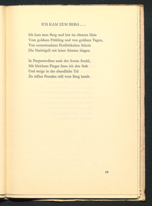 Ich kam zum Berg und hör im düstern Hain Vom goldnen Frühling und von goldnen TagiVon sonnetrunkner Festiichkeiten ScheinDie Nachtigall mit leiser Stimme Idagen.