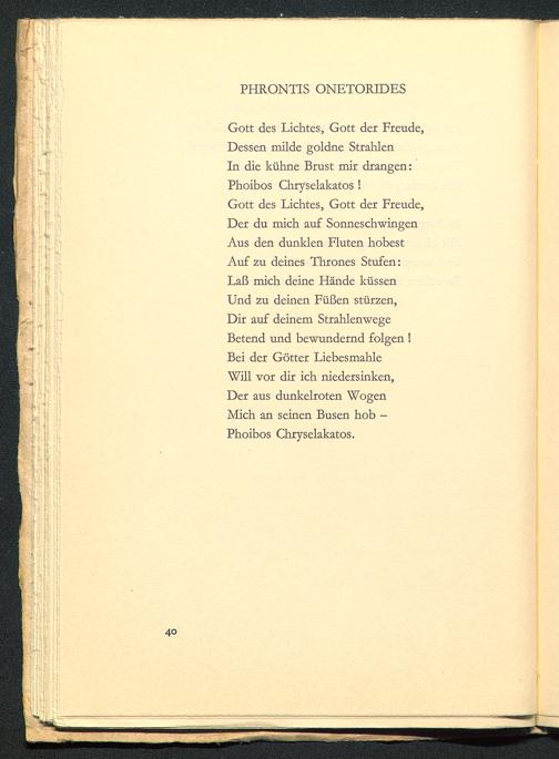 Gott des Lichtes, Gott der Freude,Dessen milde goldne StrahlenIn die kühne Brust mir drangen:Phoibos Chryselakatos !Gott des Lichtes, Gott der Freude,Der du mich auf SonneschwingenAus den dunklen Fluten hobestAuf zu deines Thrones Stufen:Laß mich deine Hände küssenUnd zu deinen Füßen stürzen,Dir auf deinem StrahlenwegeBetend und bewundernd folgen !Bei der Götter LiebesmahleWill vor dir ich niedersinken,Der aus dunkelroten WogenMich an seinen Busen hob -Phoibos Chryselakatos.