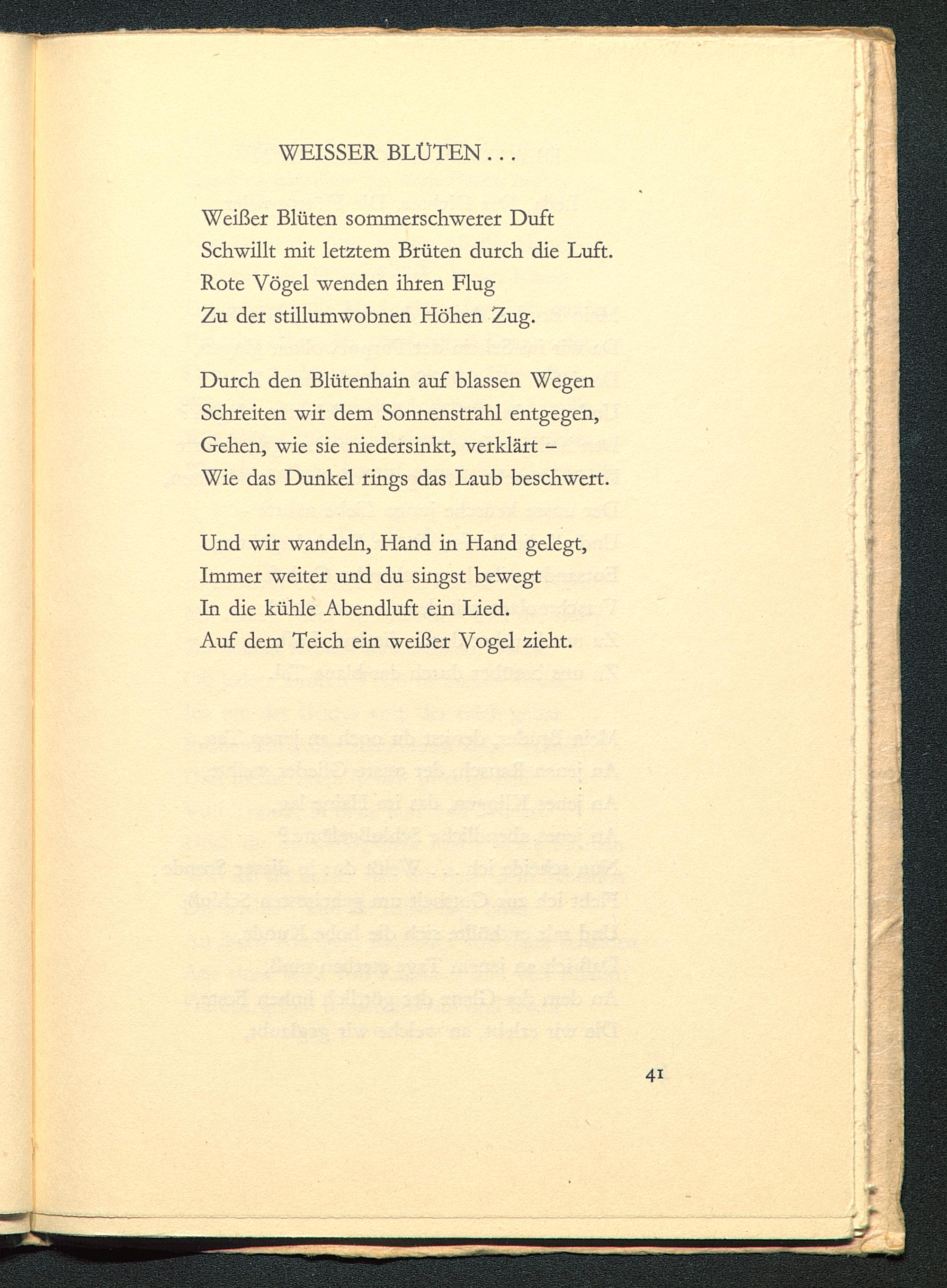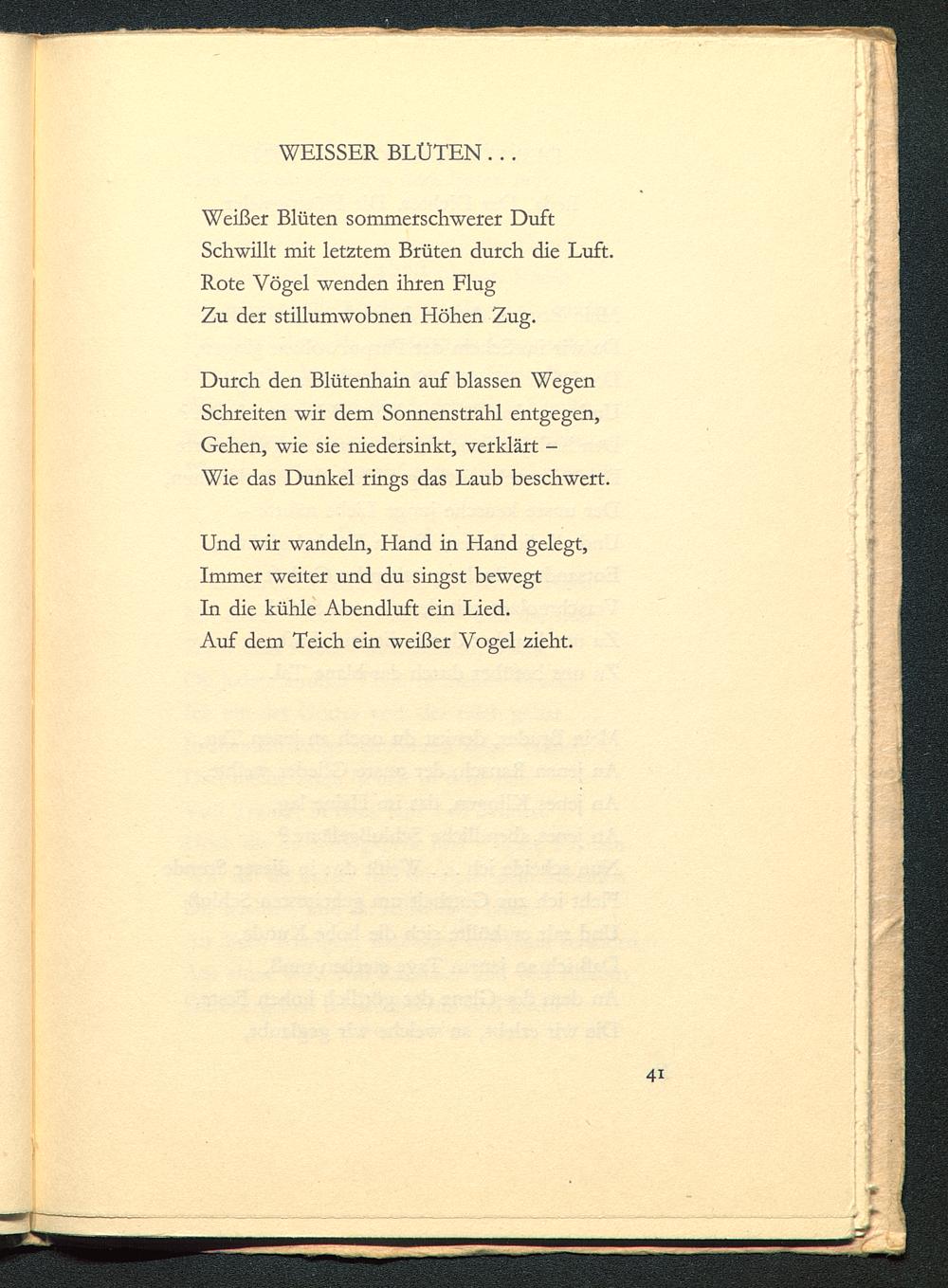 Durch den Blütenhain auf blassen WegenSchreiten wir dem Sonnenstrahl entgegen,Gehen, wie sie niedersinkt, verklärt -Wie das Dunkel rings das Laub beschwert.