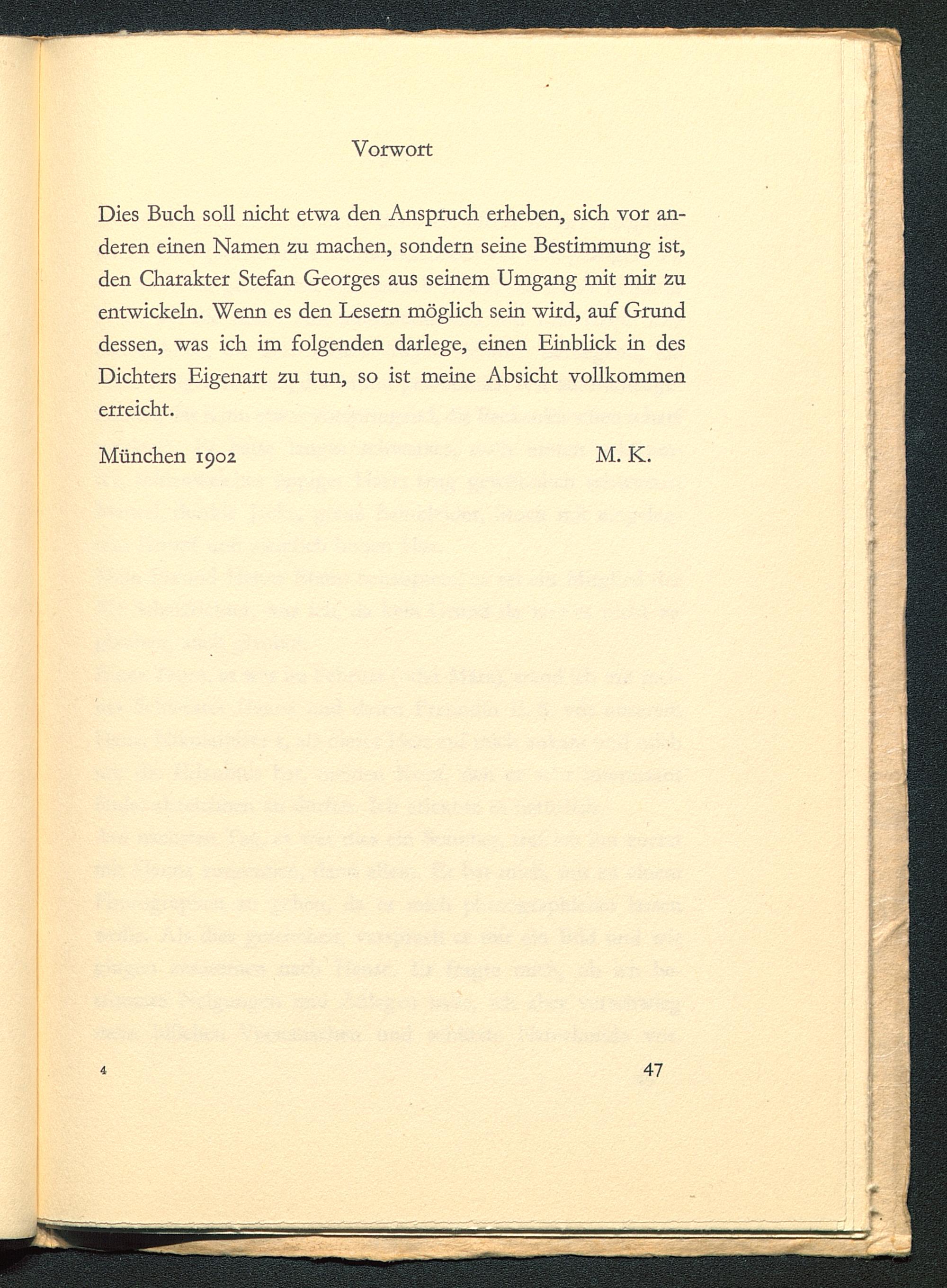 Dies Buch soll nicht etwa den Anspruch erheben, sich vor an-deren einen Namen zu machen, sondern seine Bestimmung ist,den Charakter Stefan Georges aus seinem Umgang mit mir zuentwickeln. Wenn es den Lesern möglich sein wird, auf Grunddessen, was ich im folgenden darlege, einen Einblick in desDichters Eigenart zu tun, so ist meine Absicht vollkommenerreicht.