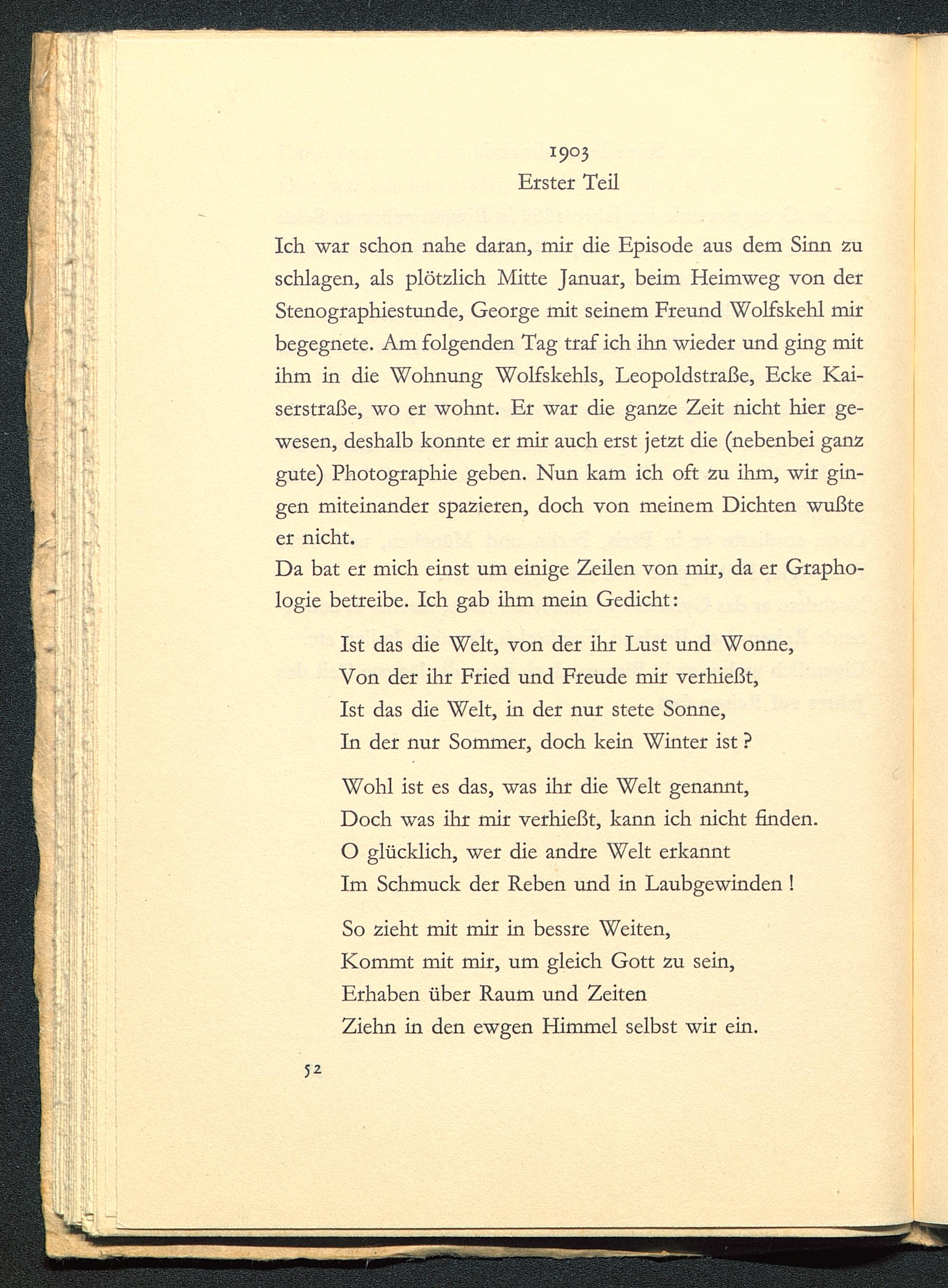 Ich war schon nahe daran, mir die Episode aus dem Sinn zuschlagen, als plötzlich Mitte Januar, beim Heimweg von derStenographiestunde, George mit seinem Freund Wolfskehl mirbegegnete. Am folgenden Tag traf ich ihn wieder und ging mitihm in die Wohnung Wolfskehls, Leopoldstraße, Ecke Kai-serstraße, wo er wohnt. Er war die ganze Zeit nicht hier ge-wesen, deshalb konnte er mir auch erst jetzt die (nebenbei ganzgute) Photographie geben. Nun kam ich oft zu ihm, wir gin-gen miteinander spazieren, doch von meinem Dichten wußteer nicht.